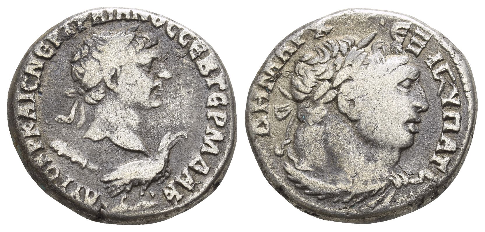 Antioch, Syria. Dated Year 16. AD 112. Obv: AYTOKR KAIC NER TRAIANOC CEB GERM DAK, laureate head right on eagle, club beneath neck. Rev: DHMARX EX I digamma YPAT digamma, laureate head of Melqart right, lionskin knotted around neck. Prieur 1516 (as Tyre); McAlee 461; BMC 16-17; RPC III 3542. 13.88gr, 24mm, 6h.