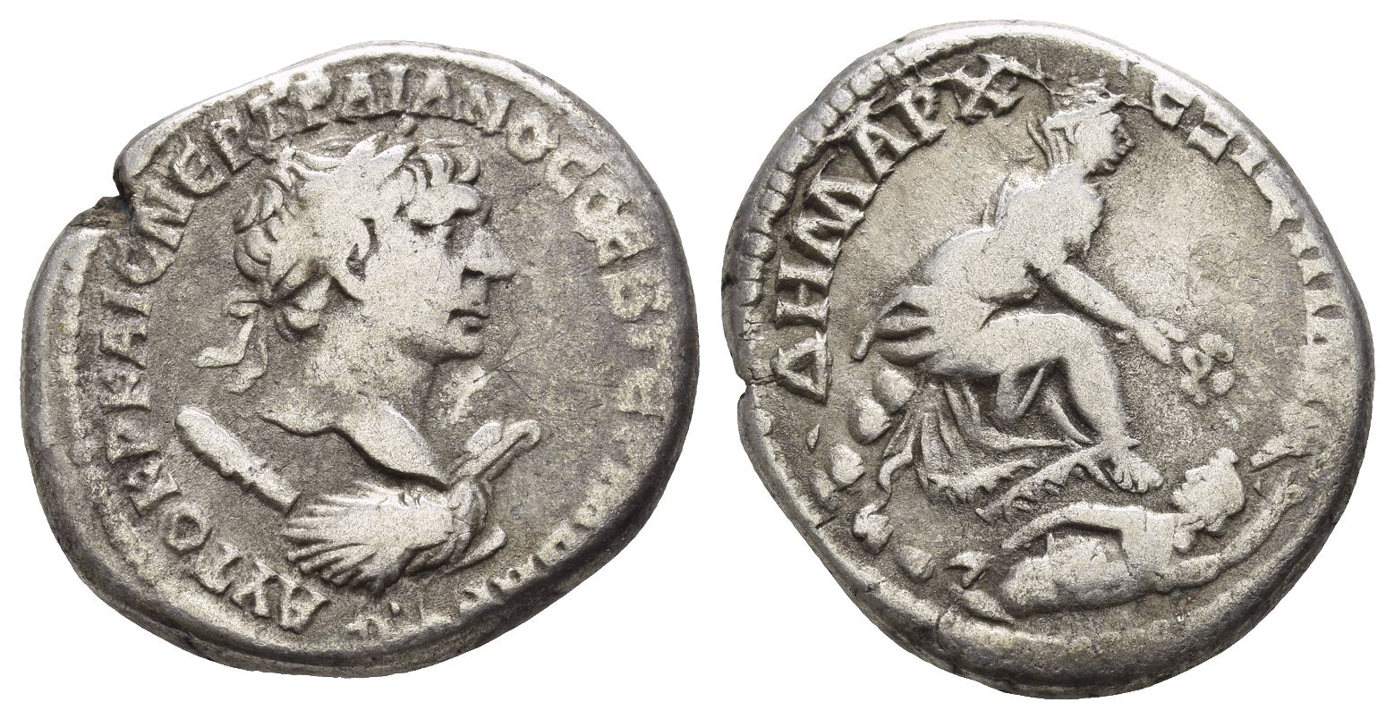 Antioch, Syria. Dated Year 16. AD 112. Obv: AYTOKR KAIC NER TRAIANOC CEB GERM DAK, laureate head right on eagle, club beneath neck. Rev: DHMARX EX I digamma YPATE, Tyche seated right on rock, holding corn-ears and poppy, river-god Orontes swimming right at foot. Prieur 1499. 13.65gr, 26mm, 7h.