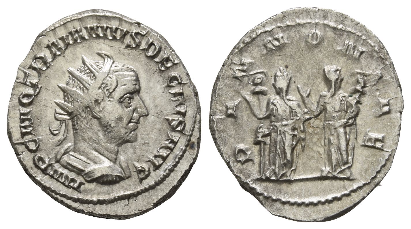 Rome mint; struck AD 250. IMP C M Q TRAIANVS DECIVS AVG, radiate, draped and cuirassed bust to right, seen from rear / PANNONIAE, the two Pannoniae, veiled and robed, standing facing, turning right and left away from one another and each holding a standard. RIC IV 21b; RSC 86. 4.41gr, 23mm, 7h.