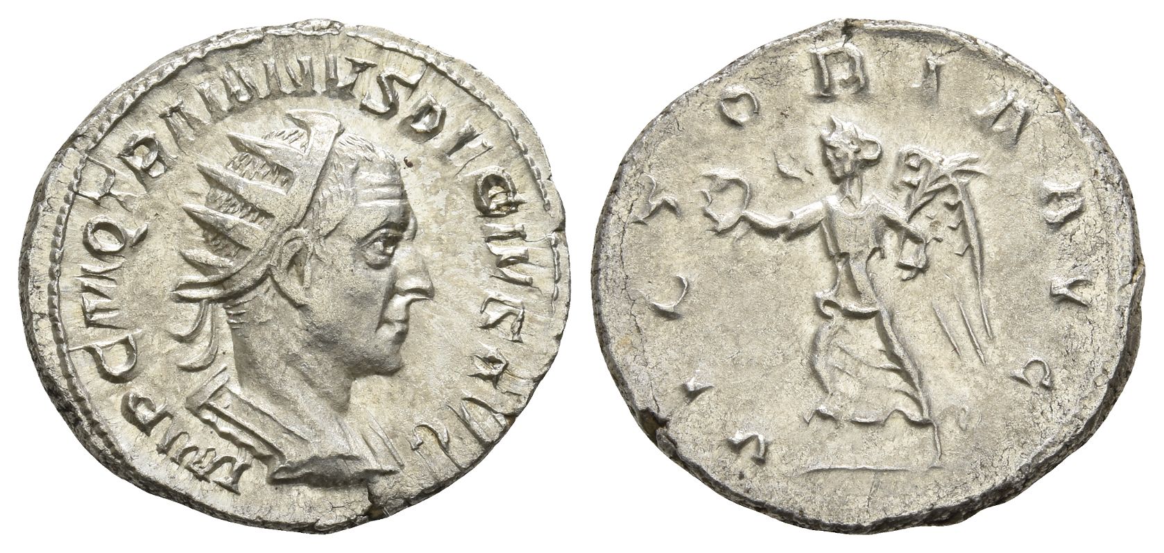 IMP C M Q TRAIANVS DECIVS AVG, radiate and cuirassed bust to right / VICTORIA AVG, Victory advancing to left, holding wreath and palm. RIC IV 29c var. (bust type); RSC 113a var. (same). 4.09gr, 22mm, 6h.