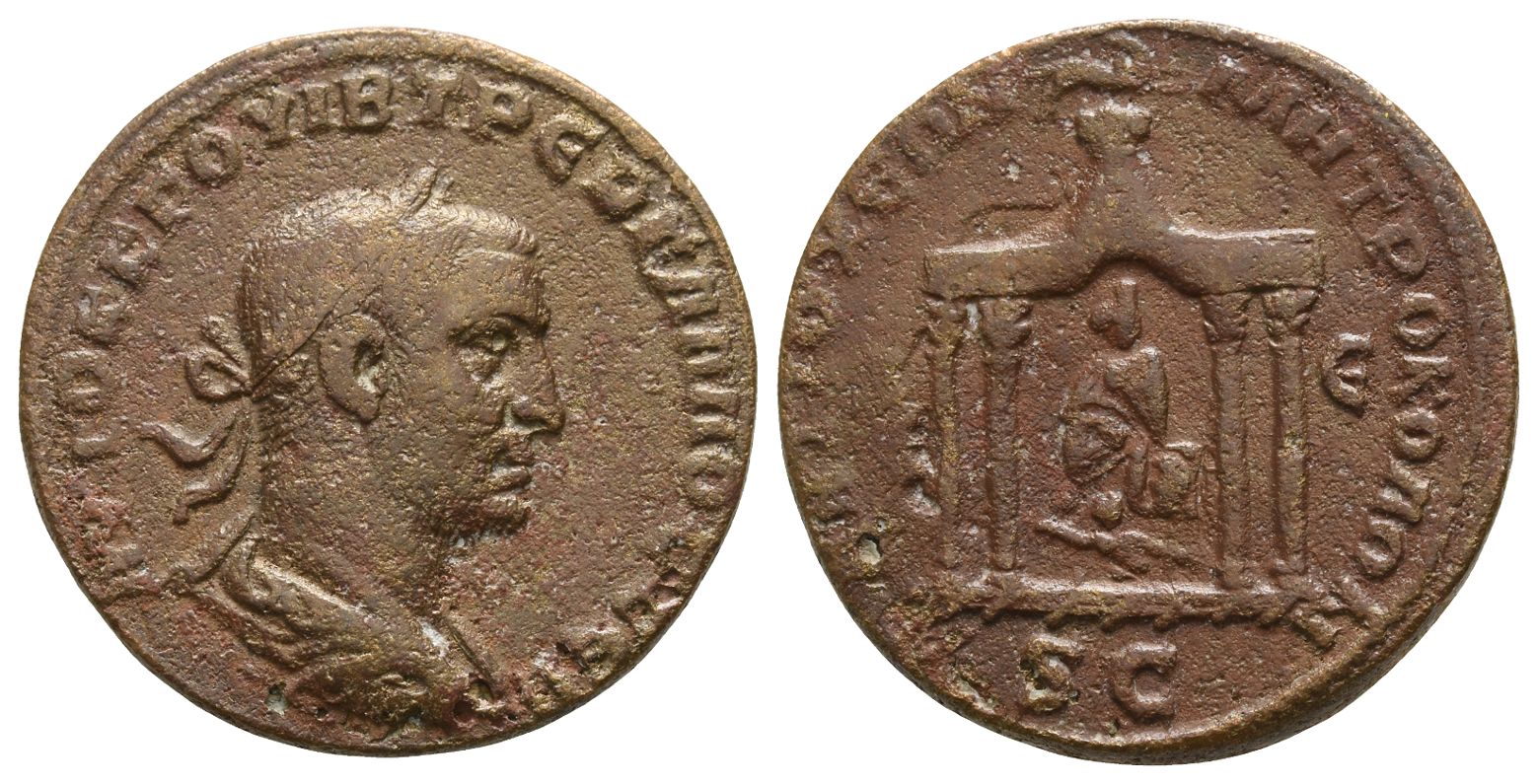 ΑΥΤΟΚ Κ Γ ΟΥΙΒ ΤΡΕΒ ΓΑΛΛΟC CΕΒ, laureate, draped and cuirassed bust to right / ANTIOXЄΩN MHTPO KOΛΩN, cult-statue of Tyche of Antioch seated facing with river-god Orontes at feet within tetrastyle temple façade with arched central bay and conical roof set on ornate base; ram leaping to right above, [Δ]-Є across upper fields, S C in exergue. McAlee 1181; SNG Copenhagen 292. 15.94gr, 29mm, 12h.