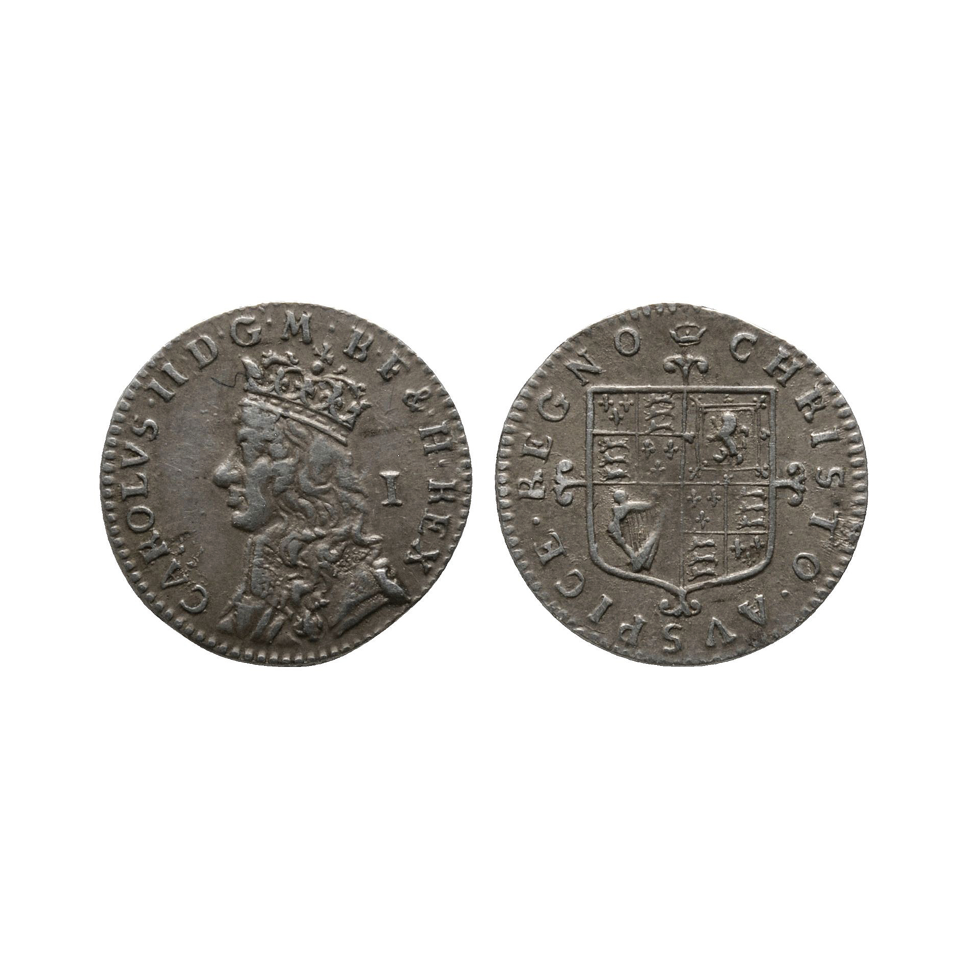 Obv: bust facing left to edge of coin with single arch crown, mark of value behind, with CAROLVS II D G M B F& H REX legend. Rev: square-topped shield with CHRISTO AVSPICE REGNO legend around, no inner circles, crown mintmark on reverse only. 0.50 grams, 12 mm.