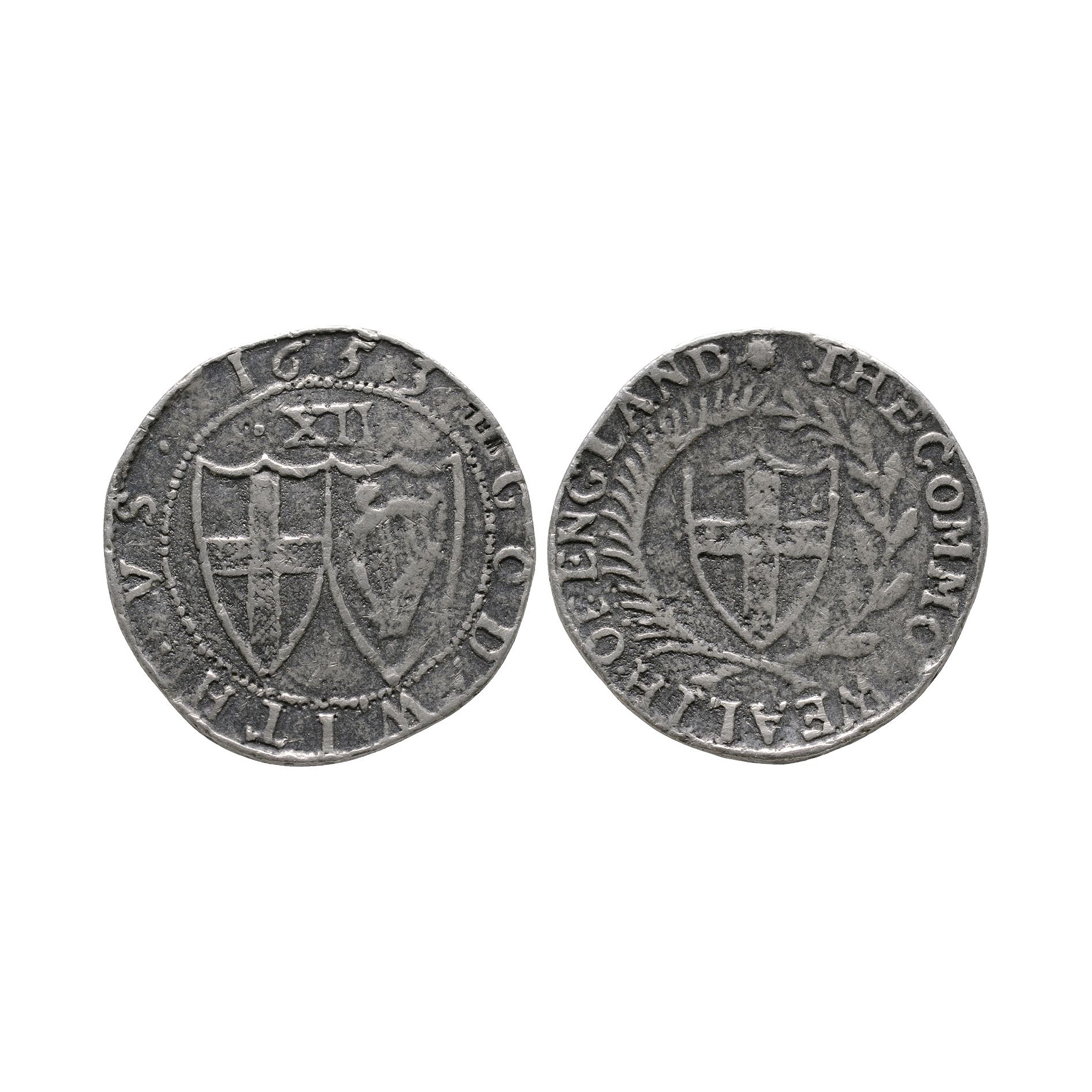 Obv: English shield within laurel and palm branch, legends in English, initial mark sun, stops at mint mark, with legend surrounding: THE. COMMONWEALTH. OF. ENGLAND. Rev: English and Irish shields, value .XII. above, beaded circle and legend surrounding, date at top, with legend surrounding: .GOD. WITH. VS. 4.20 grams.