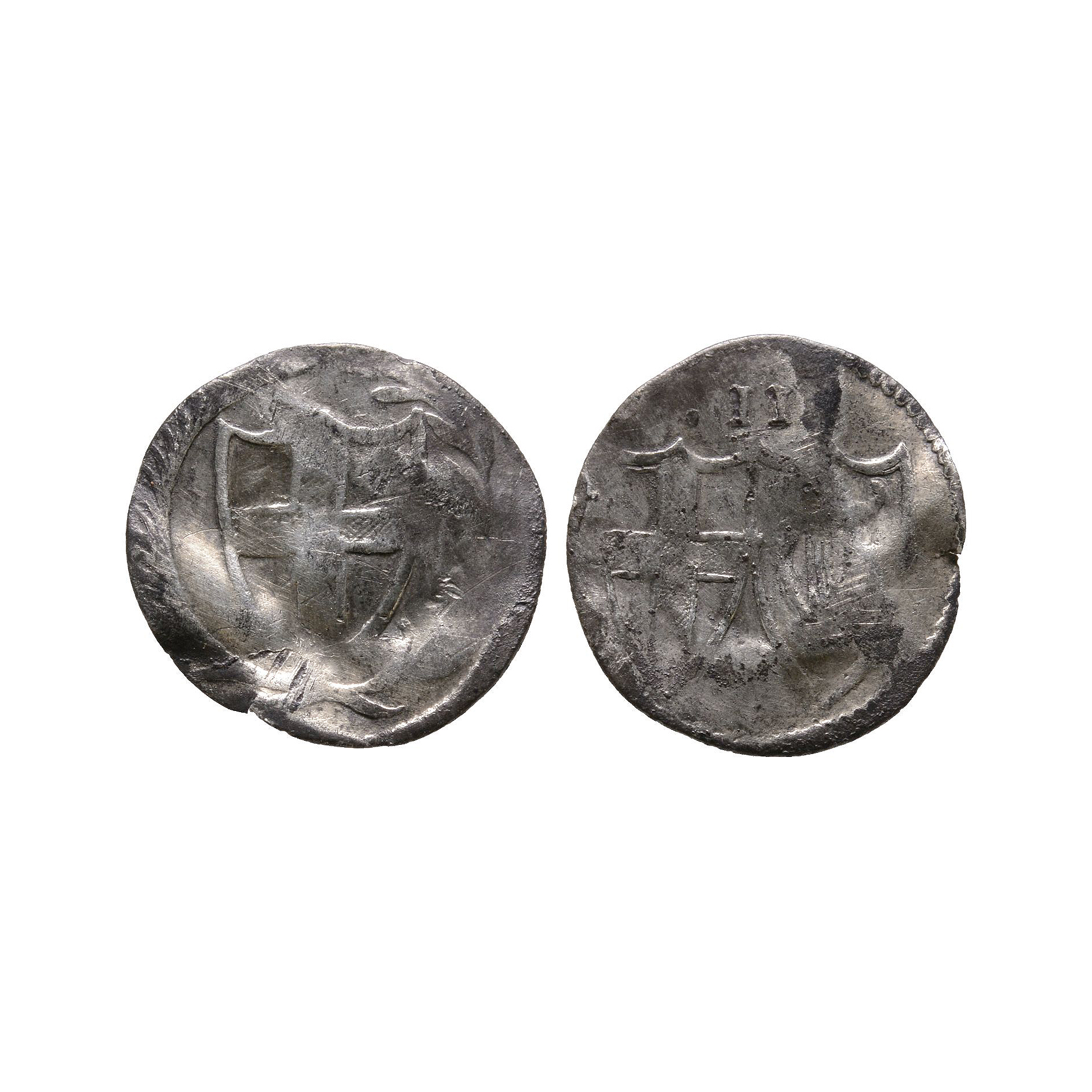 Obv: arms within wreath. Rev: double arms with II above. 0.78 grams.