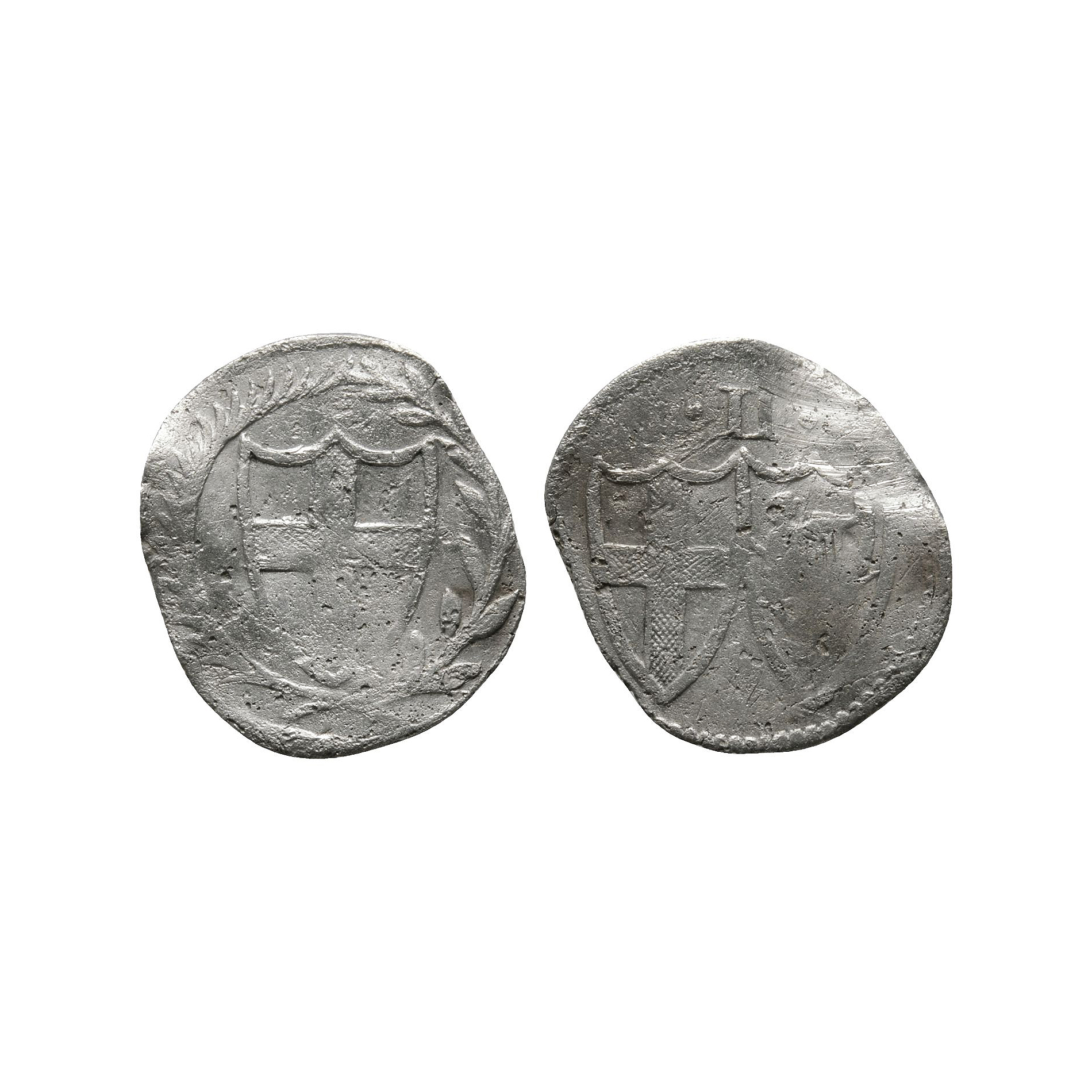 Obv: arms within wreath. Rev: double arms with .II. above. 0.80 grams, 17 mm.