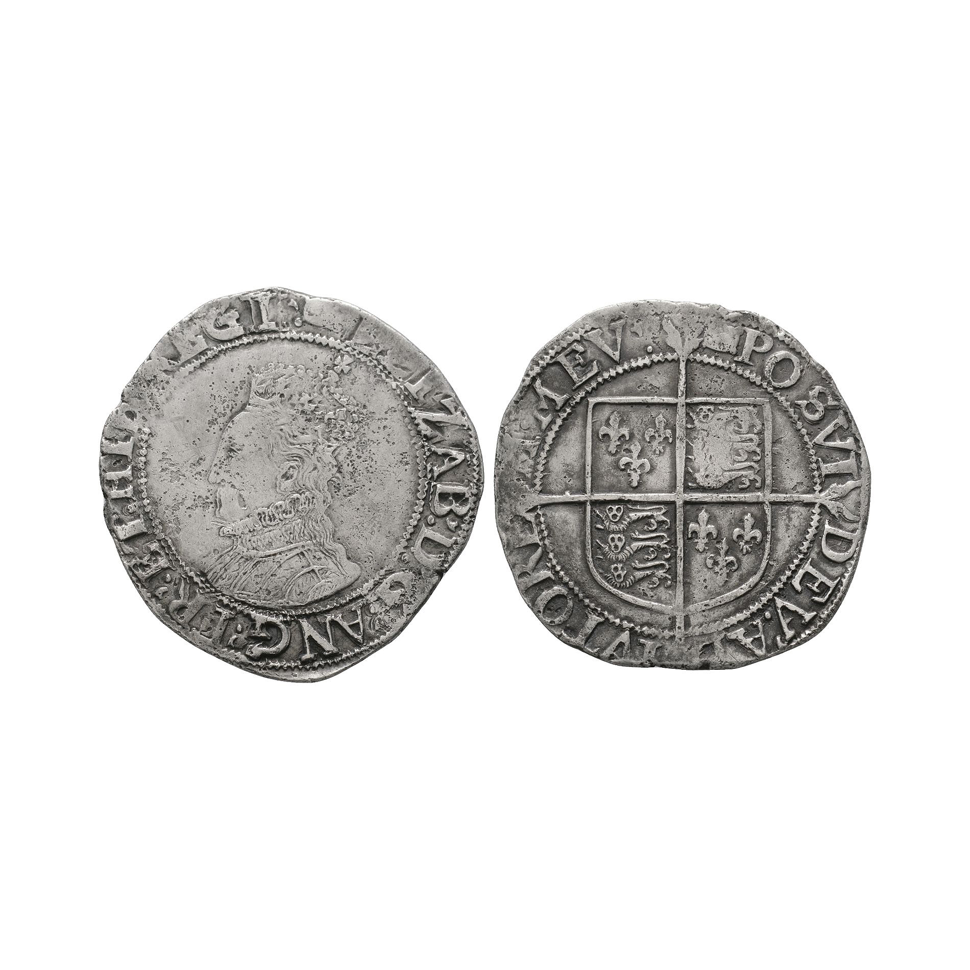 Sixth issue, bust 6B. Obv: profile bust with ELIZAB D G ANG FR ET HIB REGI legend and 'woolpack' mintmark. Rev: long cross over arms with POSVI DEV ADIVTOREM MEV legend. 6.11 grams, 31 mm.