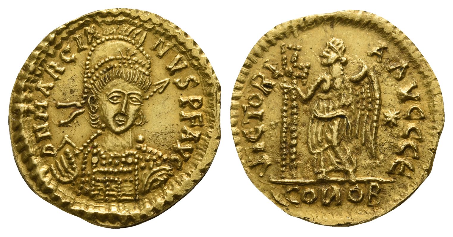 Possibly Gallic mint. In the name of Marcian (AD 450-457). D N MARCIA-INVS P F AVC, helmeted, pearl-diademed and cuirassed facing bust, holding spear in right hand and shield on left arm / VICTORI-A AVCCCЄ, Victory standing to left, holding in right hand long voided jewelled cross, star in right field; COИOB in exergue. Unpublished in the standard references, for other imitative issues in the name of Marcian cf. Depeyrot 89 (Imitations) = J.M. Fagerlie, Late Roman and Byzantine Solidi found in Sweden and Denmark, NNM 157 [1967], pl. XVI, 377; CNG-Triton 11, 2008, 1076 = Baldwin 47, 2006, 227; Gorny & Mosch 134, 2004, 3339. For prototype cf. RIC X 509; MIRB 5 (Constantinople). 4.23gr, 19mm, 6h.