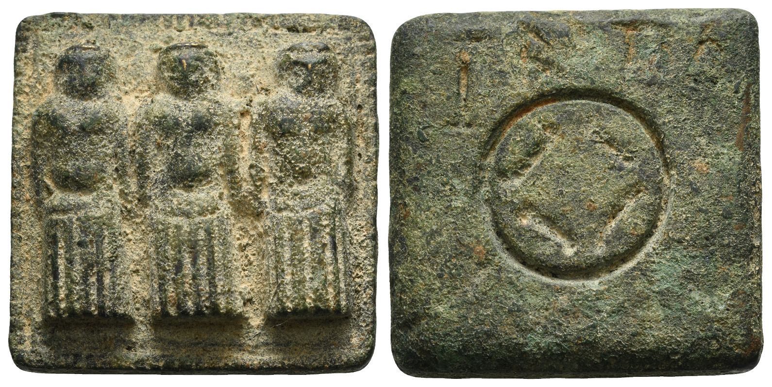 Three standing figures / Central motif. 53.43gr, 34mm x 8mm.