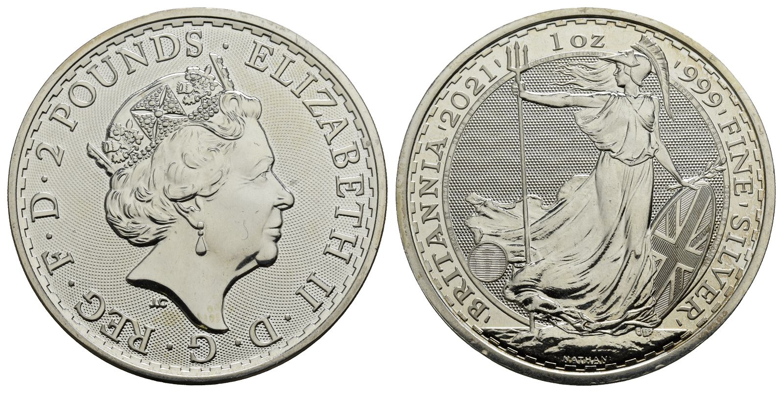 Royal Mint. Dated 2021. Silver Britannia Series. Design by Jody Clark and Philip Nathan. ELIZABETH II · D · G · REG · F · D · 2 POUNDS ·, fifth crowned portrait of Queen Elizabeth II to right, wearing the George IV State Diadem on guilloche design; J.C below / ' BRITANNIA ' 2021 ' 1oz ' 999 ' FINE ' SILVER ', Britannia standing facing, head to left, holding trident in her right hand, shield bearing the Union flag and olive branch in her left hand; security padlock to left; all on wave effect; DECUS ET TUTAMEN on inner circle, NATHAN below. Sp BSF23; KM 2019. 31.11gr, 39mm, 12h.