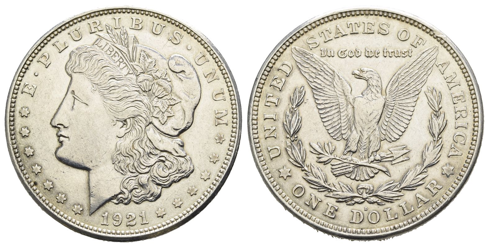 Denver mint. Morgan type. Design by George Thomas Morgan. E • PLURIBUS • UNUM, thirteen stars divided by date below Morgan style Liberty Head / ✶ UNITED STATES OF AMERICA ✶ ONE DOLLAR, IN GOD WE TRUST above eagle clutching laurel and arrows, laurel sprays around; mintmark below. KM 110. 26.61gr, 38mm, 6h.