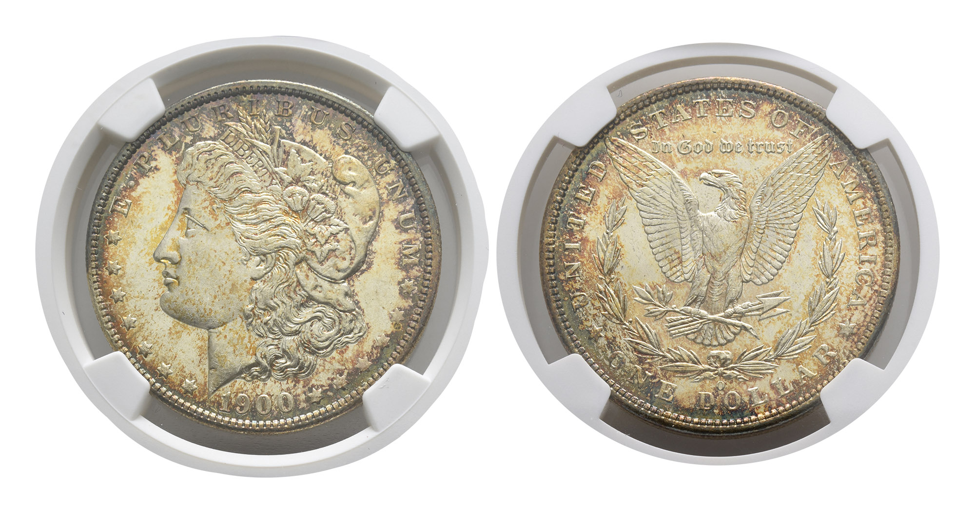 New Orleans mint. Morgan type. Design by George Thomas Morgan. E • PLURIBUS • UNUM, thirteen stars divided by date below Morgan style Liberty Head / ✶ UNITED STATES OF AMERICA ✶ ONE DOLLAR around, IN GOD WE TRUST above eagle clutching laurel and arrows, laurel sprays around; mintmark below. KM 110. NGC graded MS 64 (#242345-009).