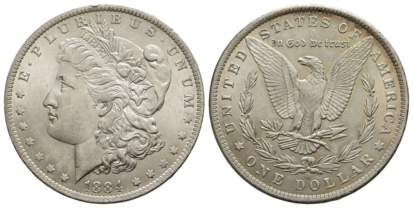 New Orleans mint. Morgan type. Design by George Thomas Morgan. E • PLURIBUS • UNUM, thirteen stars divided by date below Morgan style Liberty Head / ✶ UNITED STATES OF AMERICA ✶ ONE DOLLAR around, IN GOD WE TRUST above eagle clutching laurel and arrows, laurel sprays around; mintmark below. KM 110. 26.70gr, 38mm, 6h.