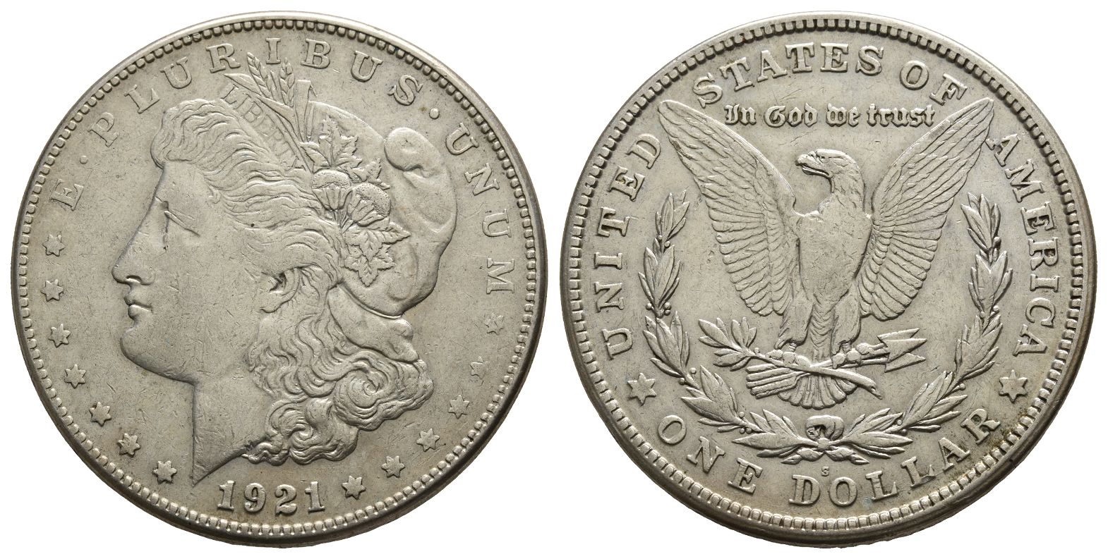 San Francisco mint. Morgan type. Design by George Thomas Morgan. E • PLURIBUS • UNUM, thirteen stars divided by date below Morgan style Liberty Head / ✶ UNITED STATES OF AMERICA ✶ ONE DOLLAR around, IN GOD WE TRUST above eagle clutching laurel and arrows, laurel sprays around; mintmark below. KM 110. 26.56gr, 38mm, 6h.