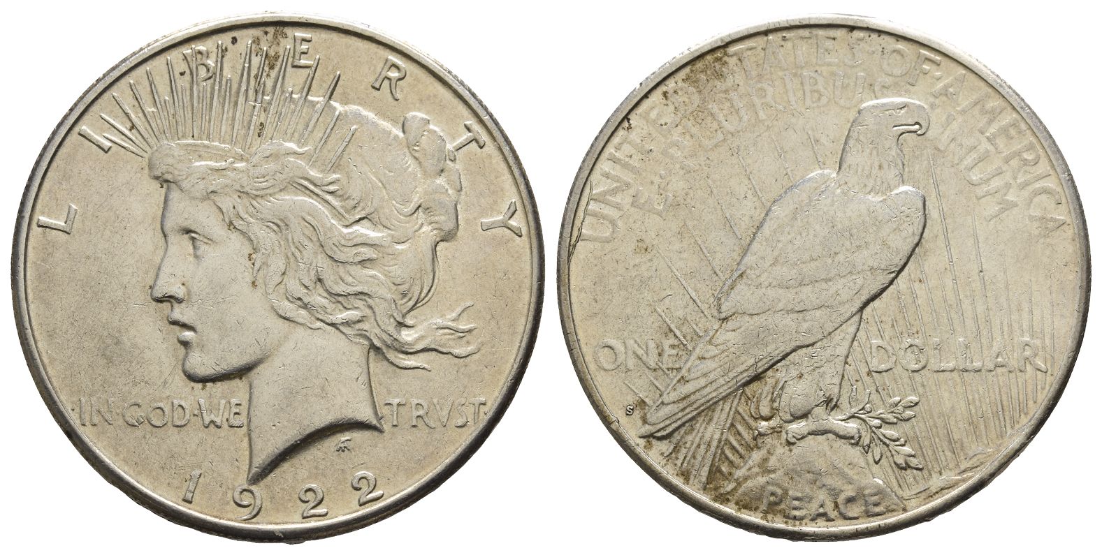 San Francisco mint. Peace type. LIBERTY, head of Liberty to left, wearing radiate headband, IN GOD WE TRUST across fields; date below / UNITED • STATES • OF • AMERICA E • PLURIBUS UNUM, eagle standing to right on rock, wings closed, seen from rear, branch in talons, rays behind, PEACE below; ONE DOLLAR across fields; mintmark S in lower left field. KM 150. 26.61gr, 38mm, 6h.