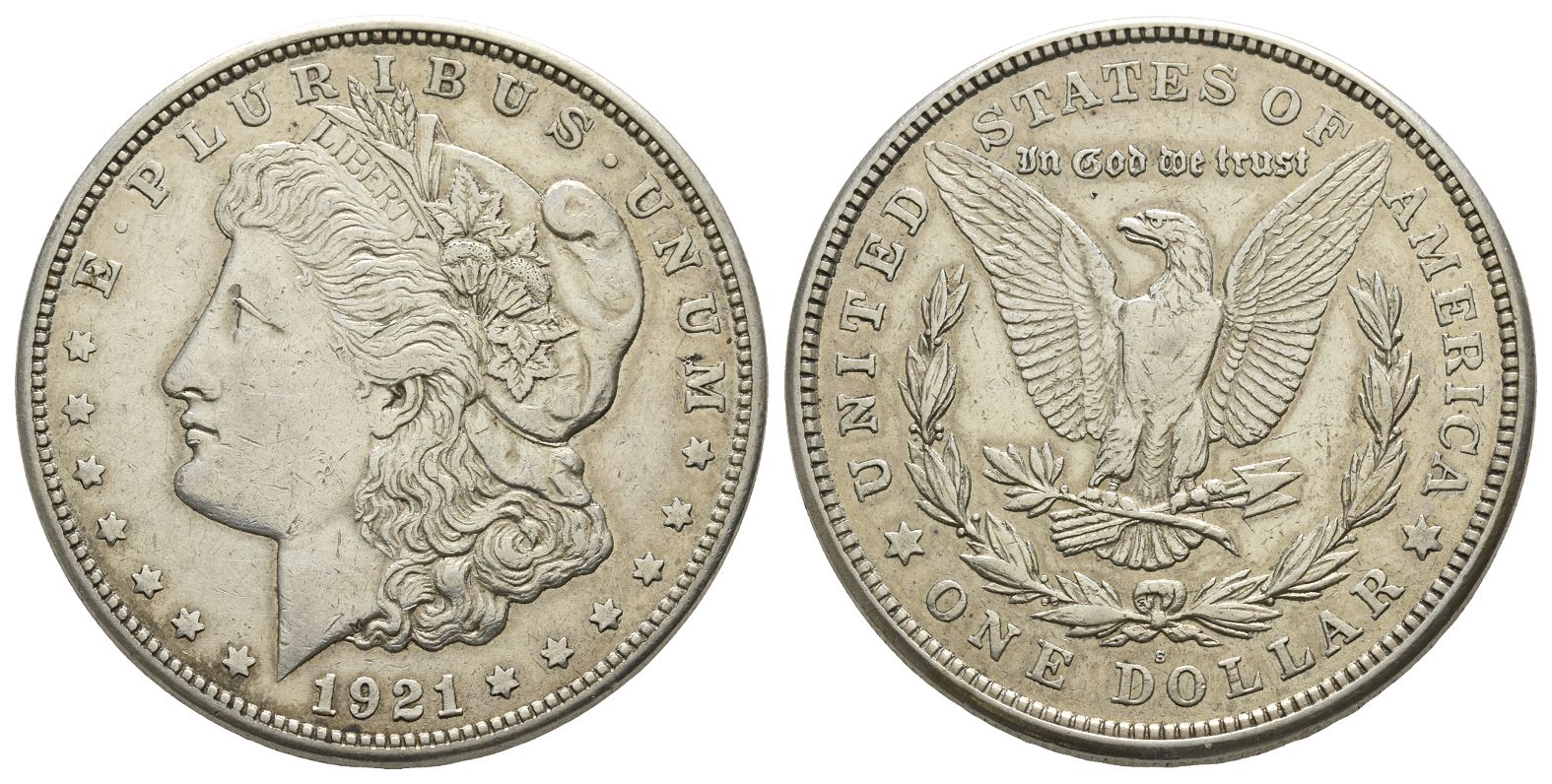 San Francisco mint. Morgan type. Design by George Thomas Morgan. E • PLURIBUS • UNUM, thirteen stars divided by date below Morgan style Liberty Head / ✶ UNITED STATES OF AMERICA ✶ ONE DOLLAR, IN GOD WE TRUST above eagle clutching laurel and arrows, laurel sprays around; mintmark below. KM 110. 26.64gr, 38mm, 6h.