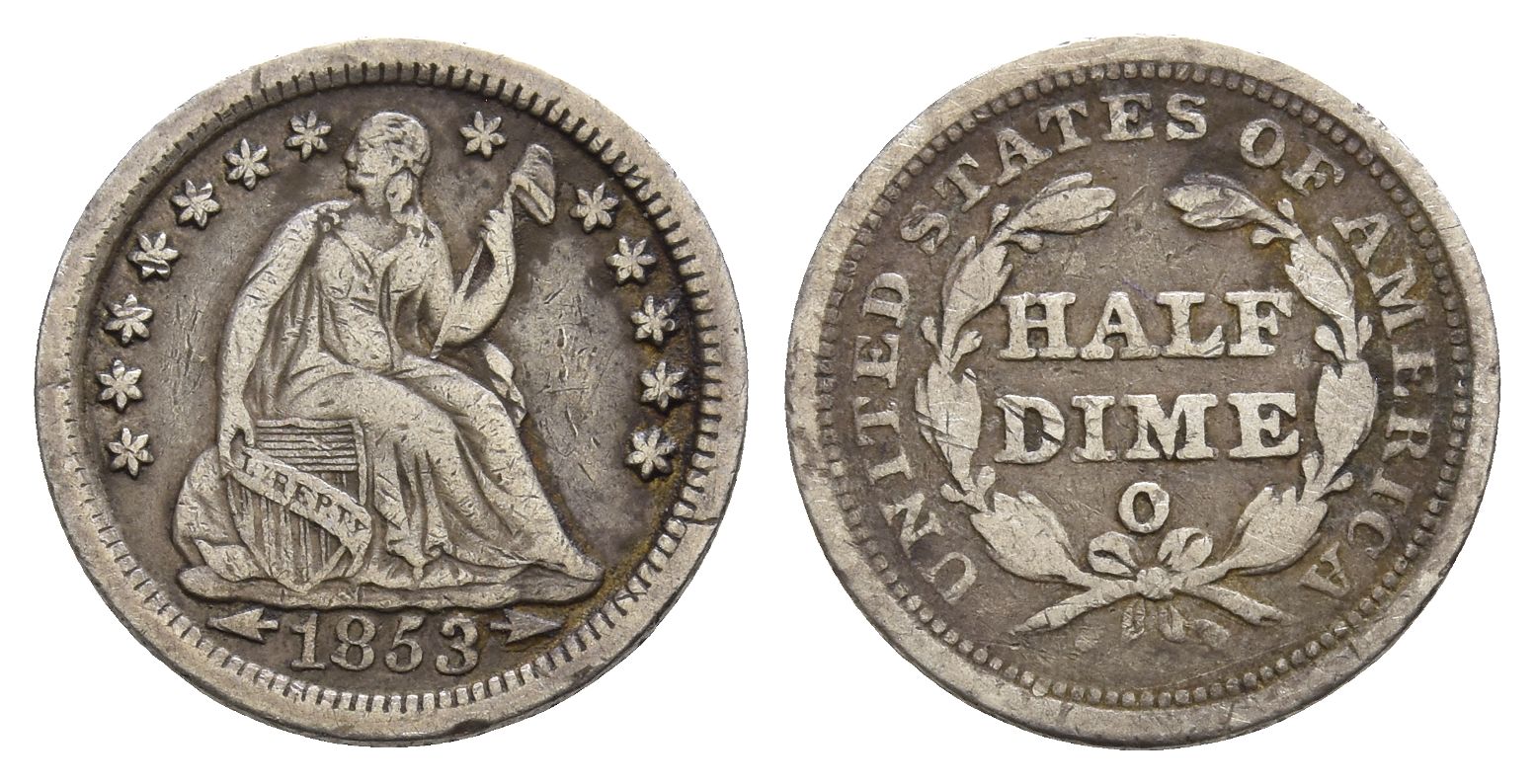 Back to previous pageUnited States of America AR Half Dime or 5 Cents. Dated 1853. New Orleans mint. Date with arrows.