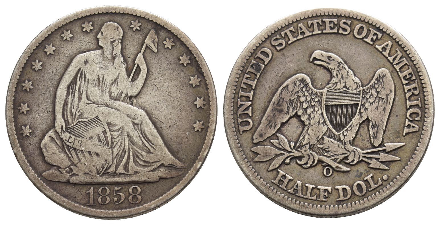Back to previous pageUnited States of America AR Seated Liberty Half Dollar or 50 Cents. Dated 1858. New Orleans mint.