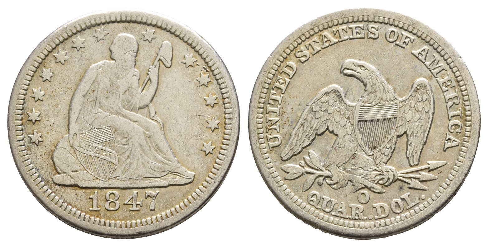 Back to previous pageUnited States of America AR Seated Liberty Quarter Dollar or 25 Cents. Dated 1847. New Orleans mint.