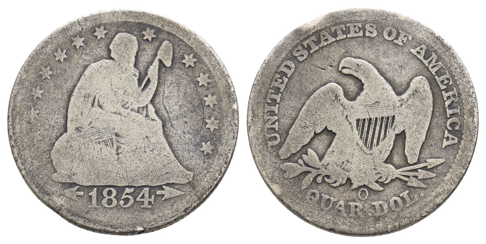 Back to previous pageUnited States of America AR Seated Liberty Quarter Dollar or 25 Cents. Dated 1854. New Orleans mint. Date with arrows.