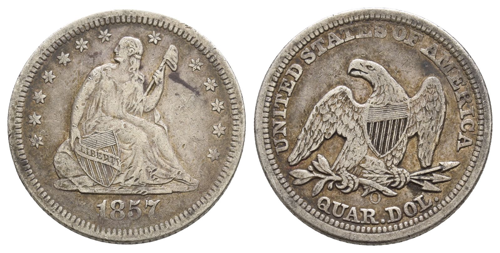 United States of America AR Seated Liberty Quarter Dollar or 25 Cents. Dated 1857. New Orleans mint.