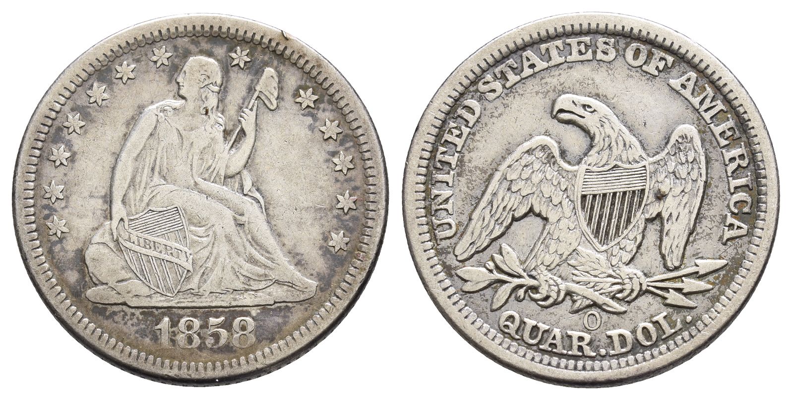 Back to previous pageUnited States of America AR Seated Liberty Quarter Dollar or 25 Cents. Dated 1858. New Orleans mint.