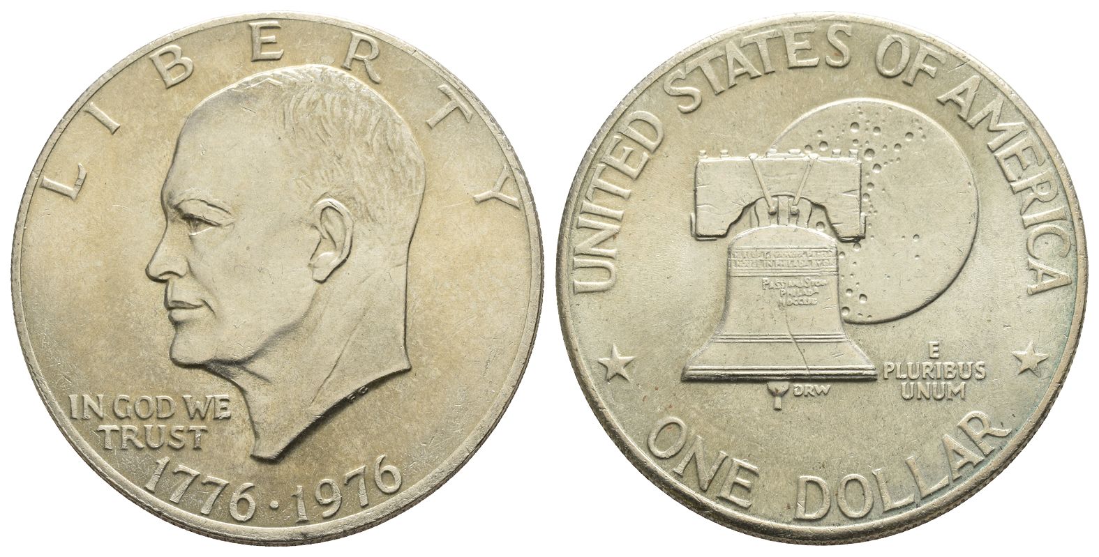 Designs by Frank Gasparro and Dennis R. Williams. LIBERTY above, IN GOD WE TRUST in two lines in left field, head of Dwight D. Eisenhower to left, FG in small lettering on truncation, 1776·1976 below / UNITED STATES OF AMERICA above The Liberty Bell inscribed THEREOF LEV. XXV. V X. PROCLAIM HOUSE OF PHILADA BY OR