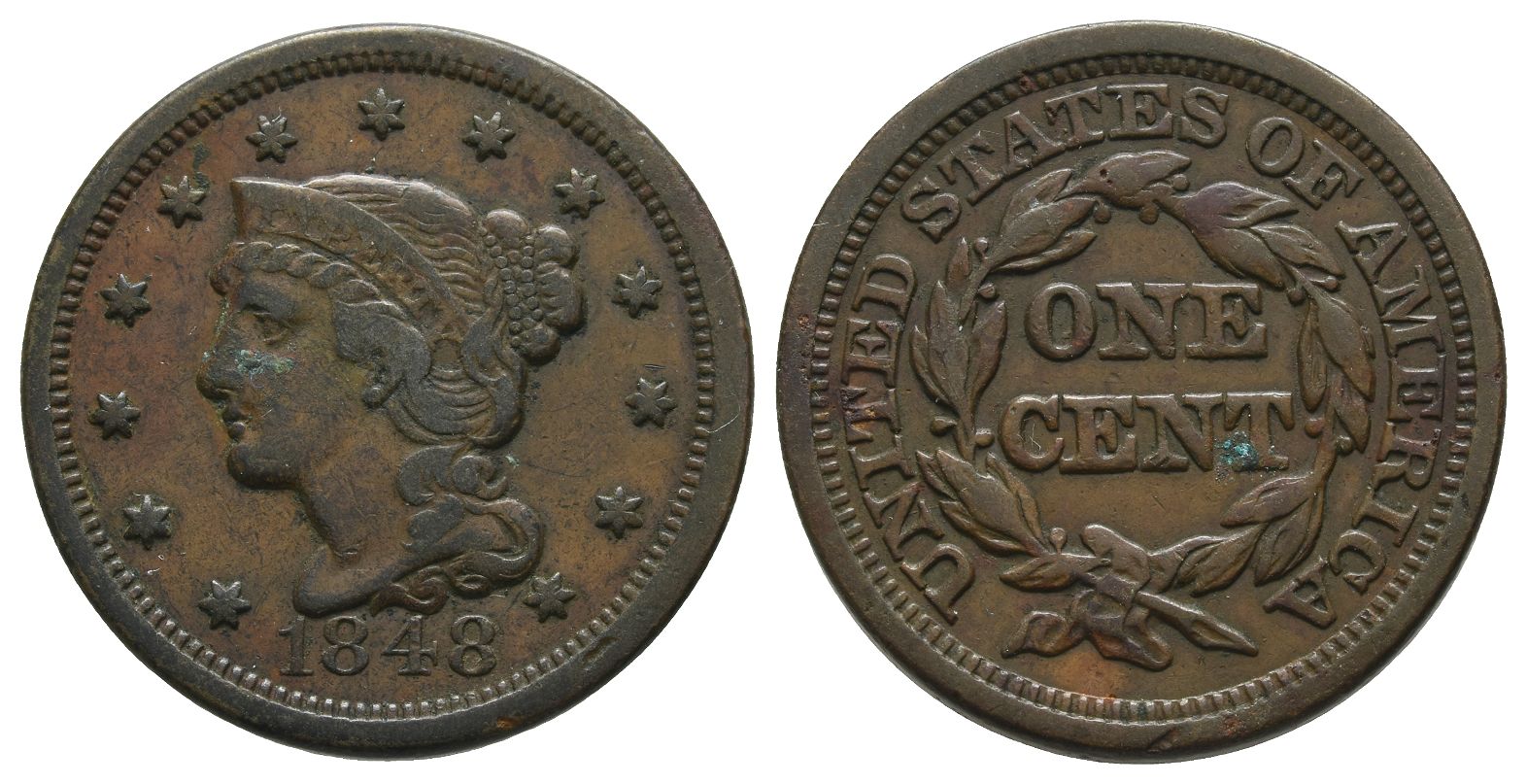 Philadelphia mint. Dated 1848. "Liberty Head - Braided Hair" type. Design by Christian Gobrecht. Head of Liberty to left, date below, thirteen stars around / UNITED STATES OF AMERICA around, ONE CENT within wreath. KM 67. 10.53gr, 27mm, 6h.