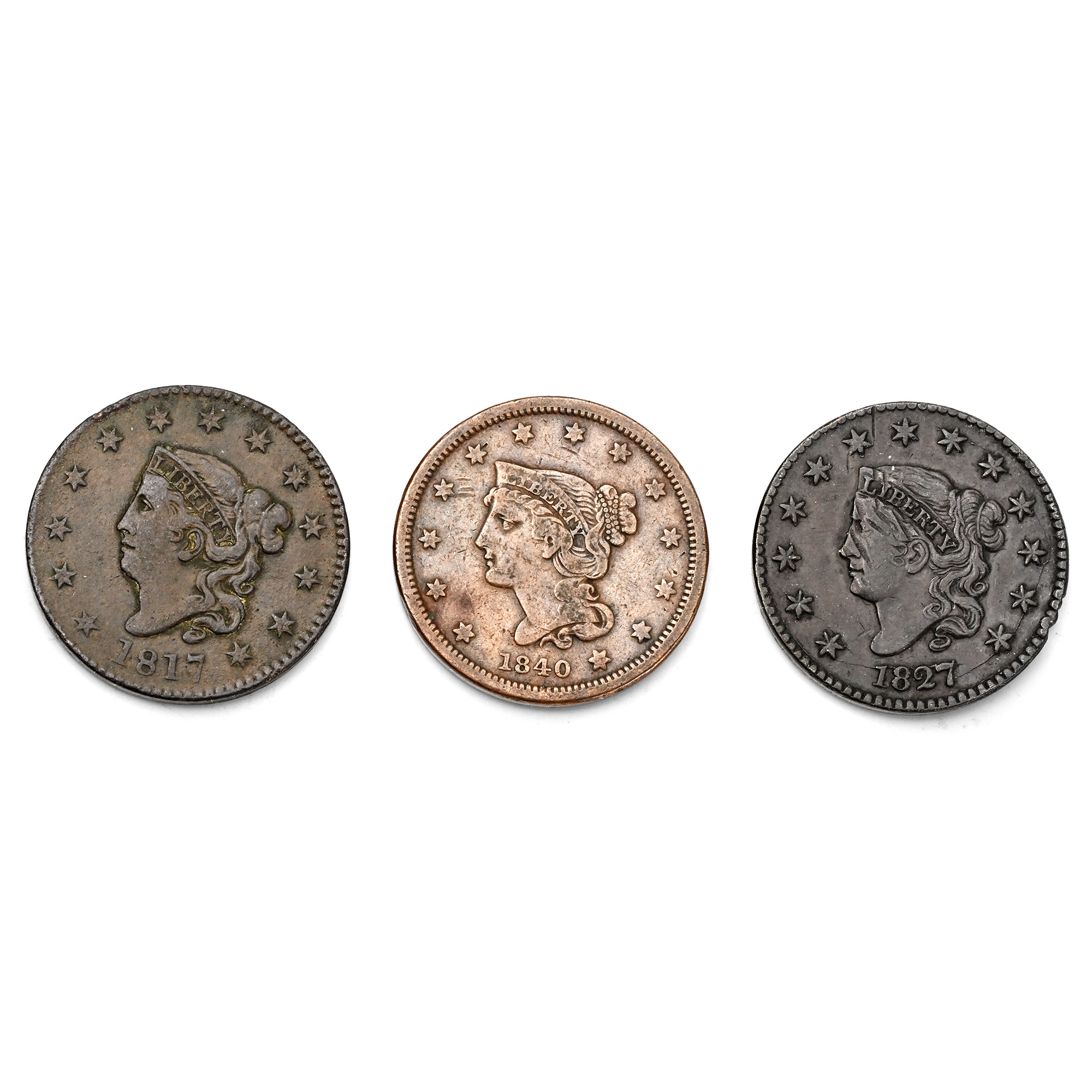 Back to previous pageUnited States of America. Group of Three [3] AE Braided Hair Cents. 1817-1840.