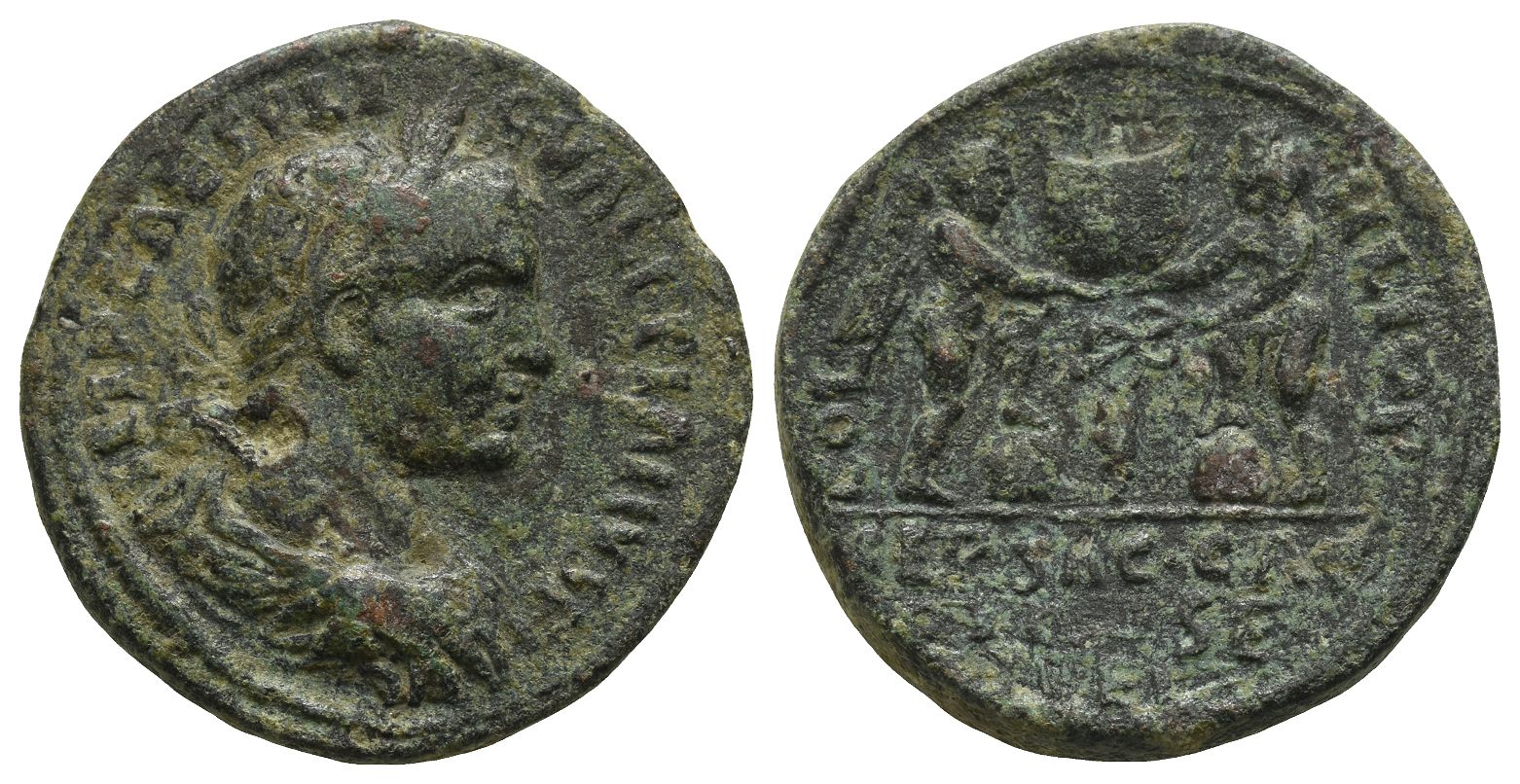 IMP CAES P LIC VALERIANVS P F AVG, laureate, draped, and cuirassed bust to right, seen from behind / COL HLIOP around and CER SAC • CAP OIC • ISE HEL (Colonia Hliopolis Sacra Capitolina Oicumenica Iselastica Heliopolitana) in three lines beneath Nike standing to right vis-à-vis Hermes, standing to left, holding caduceus; both with foot on globe, ear of grain between them and supporting agonistic crown with two palm fronds. RPC X, Online Unassigned ID 88404; Sawaya -; BMC -; SNG Copenhagen -; SNG München -. 17.55gr, 28mm, 12h.