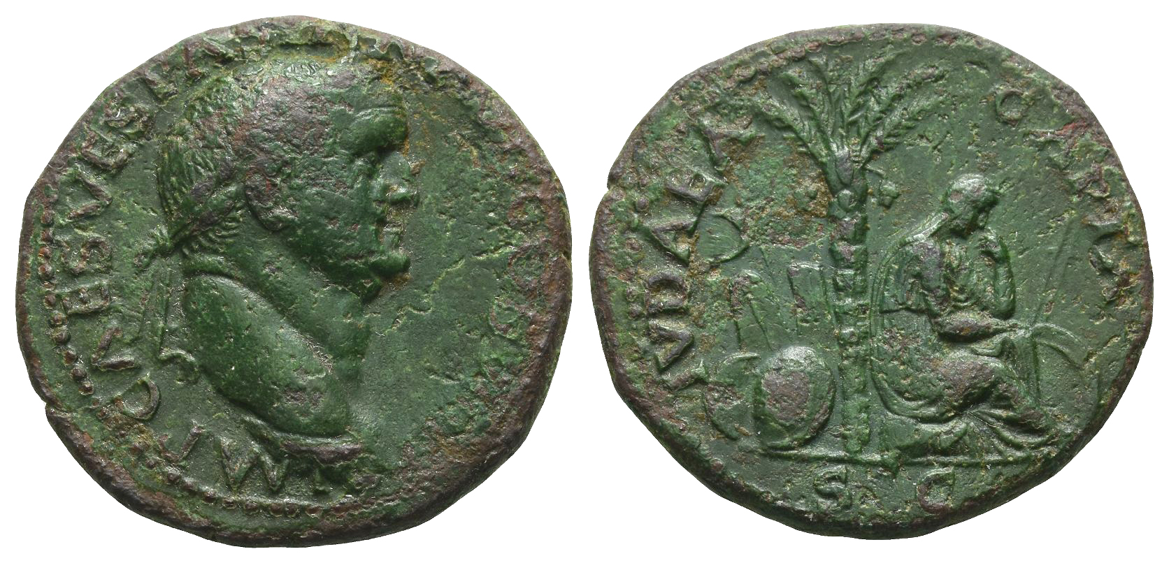 Lugdunum mint; struck AD 77-78. "Judaea Capta" commemorative. IMP CAES VESPASIAN [...], laureate head to right / IVDAEA CAPTA, Judaea seated to right on cuirass in attitude of mourning, surrounded by arms, resting her head on her left hand; behind, palm tree. Cf. RIC II.1 1233; cf. Cohen 240. 10.64gr, 28mm, 6h