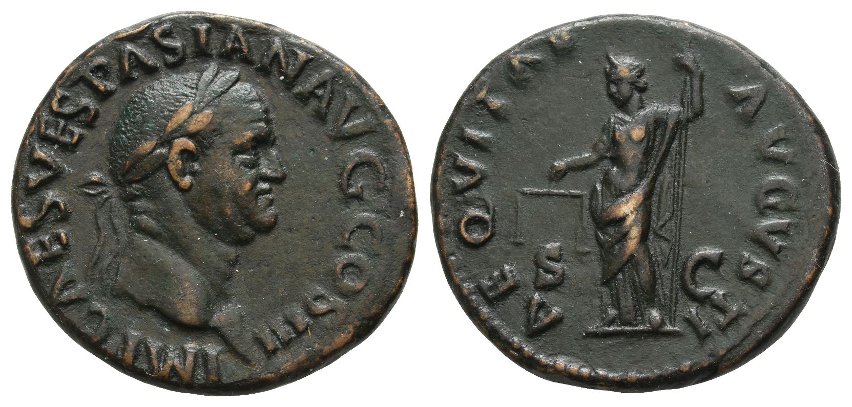Rome mint; struck AD 71. IMP CAES VESPASIAN AVG COS III, laureate head to right / AEQVITAS AVGVSTI, Aequitas standing facing, head to left, holding scales in her right hand and sceptre in her left; S C across lower field. RIC II 287; Cohen 13; BMCRE 600. 11.29gr, 28mm, 6h.