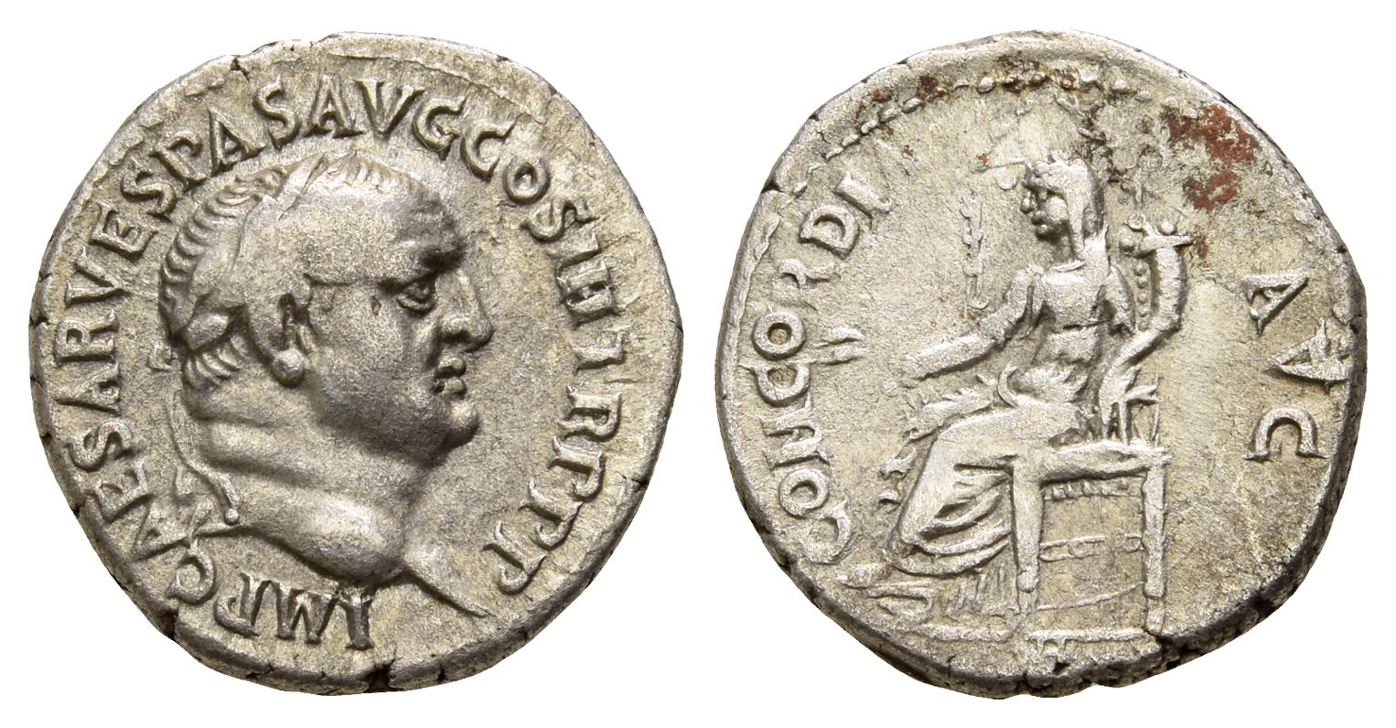 Ephesus mint; struck AD 71. IMP CAESAR VESPAS AVG COS III TR P P P, laureate head to right / CONCORDIA AVG, Ceres seated to left, on ornate high-backed chair, holding corn ears and poppy with her right hand and cornucopia with her left; [EPHE (ligate) in exergue]. RIC II.1 1428; RPC II 830; BMCRE 453; RSC 67. 2.92gr, 17mm, 7h
