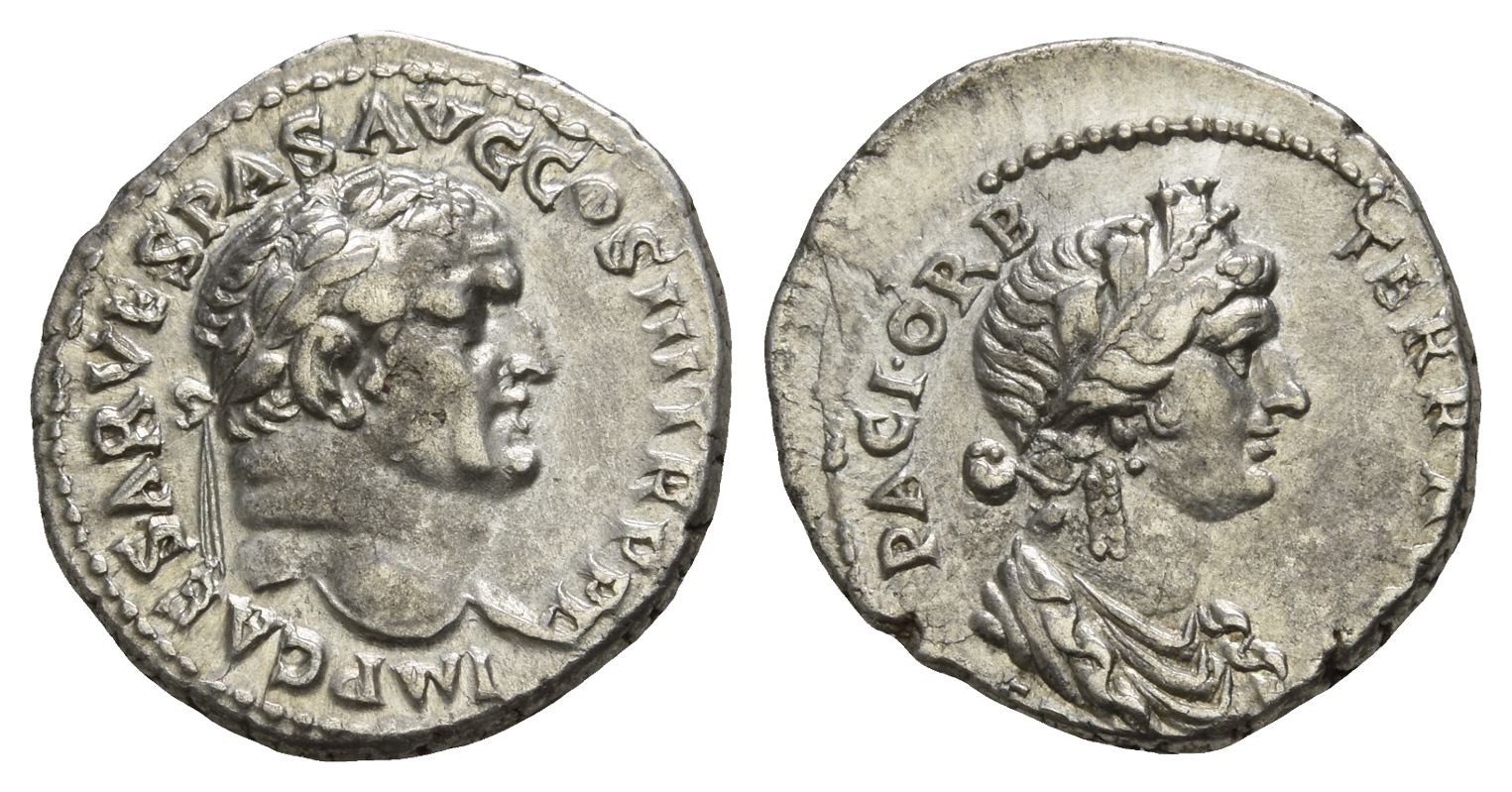 Ephesus mint; struck AD 71. IMP CAESAR VESPAS AVG COS III TR P P P, laureate head to right / PACI • ORB TERR • AVG, turreted and draped female bust to right, [EPHE (ligate)] below. RIC II.1 1433; BMCRE 459; RSC 293. 3.37gr, 18mm, 7h.