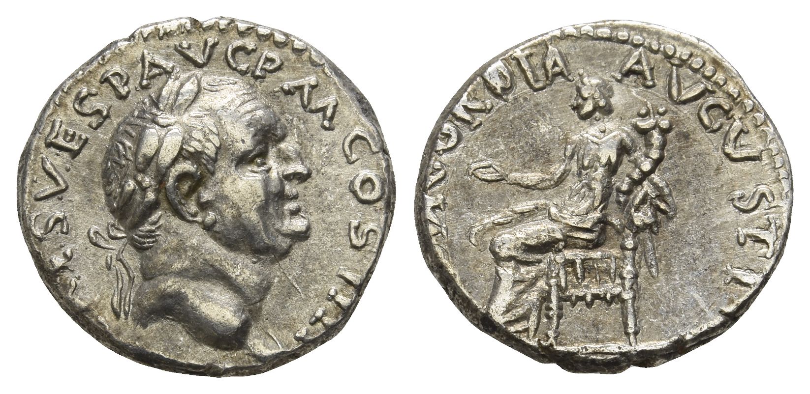 Antioch mint; struck AD 72-73. [IMP] CAES VESP AVG P M COS IIII, laureate head to right / CONCORDIA AVGVSTI, Concordia seated to left, holding patera and cornucopia. RIC II.1 1554; RPC II 1927; BMCRE 505; RSC 74. 3.12gr, 17mm, 6h.