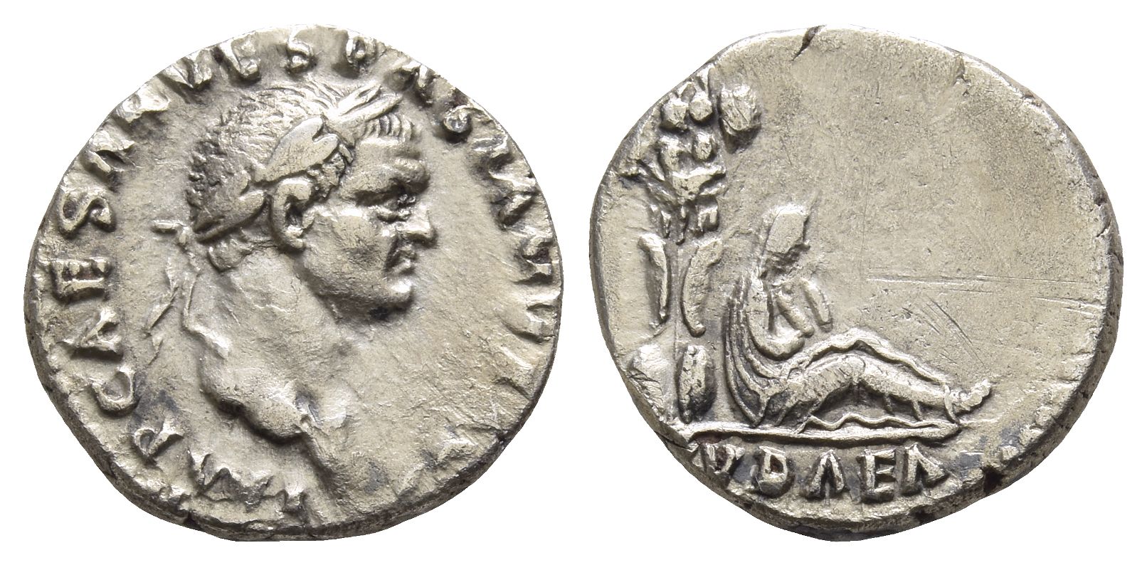 IMP CAESAR VESPASIANVS AVG, laureate head to right / Judaea seated to right against trophy; IVDAEA in exergue. RIC II.1 2; BMCRE 35; RSC 226. 3.03gr, 17mm, 6h.