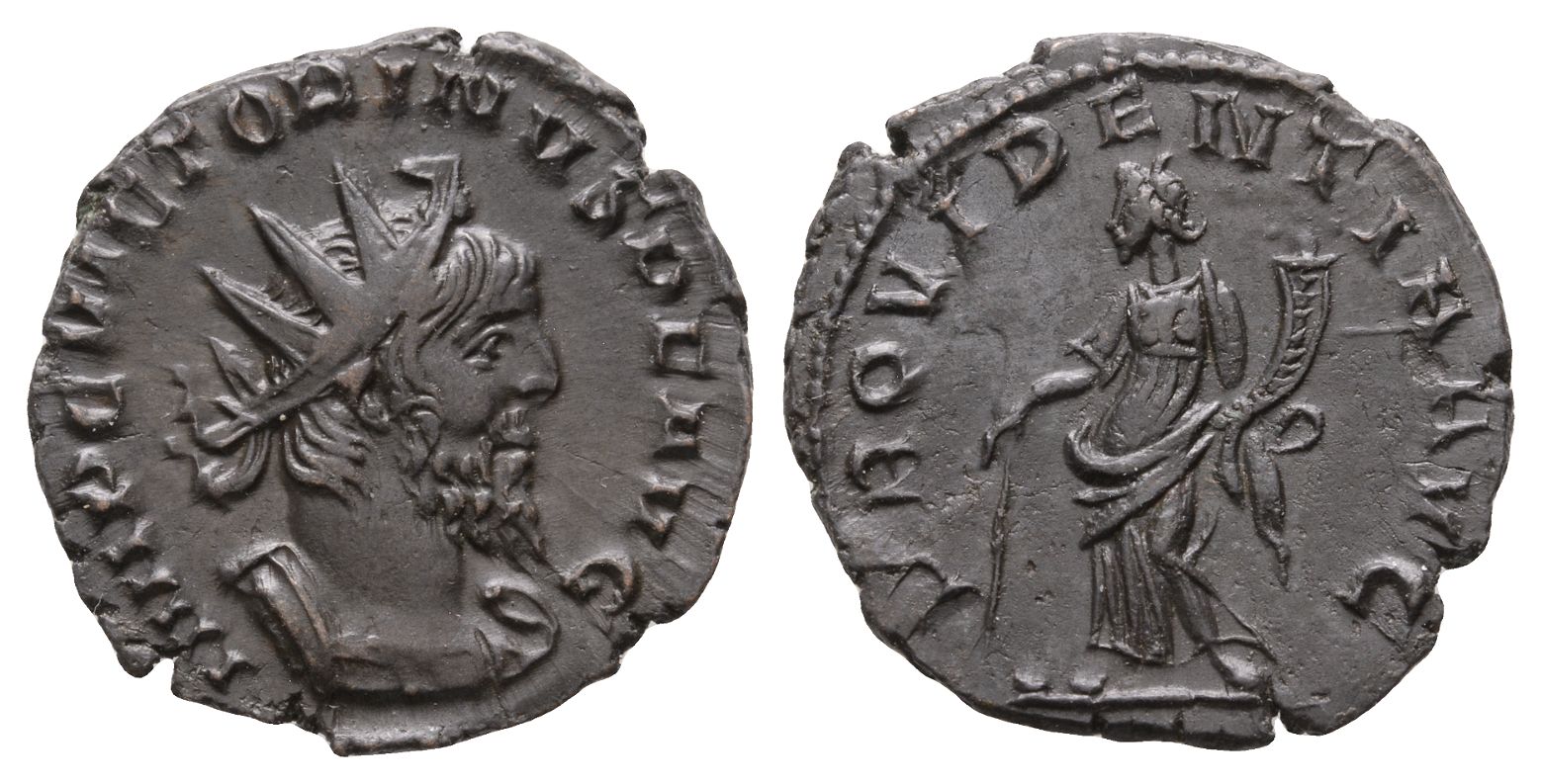 Colonia Agrippinensis mint; struck AD 271. IMP C VICTORINVS P F AVG, radiate and cuirassed bust to right / PROVIDENTIA AVG, Providentia standing facing, head to left, holding baton above globe with right hand and cornucopia with left. RIC V.2 61 (Southern mint). 2.66gr, 21mm, 7h.