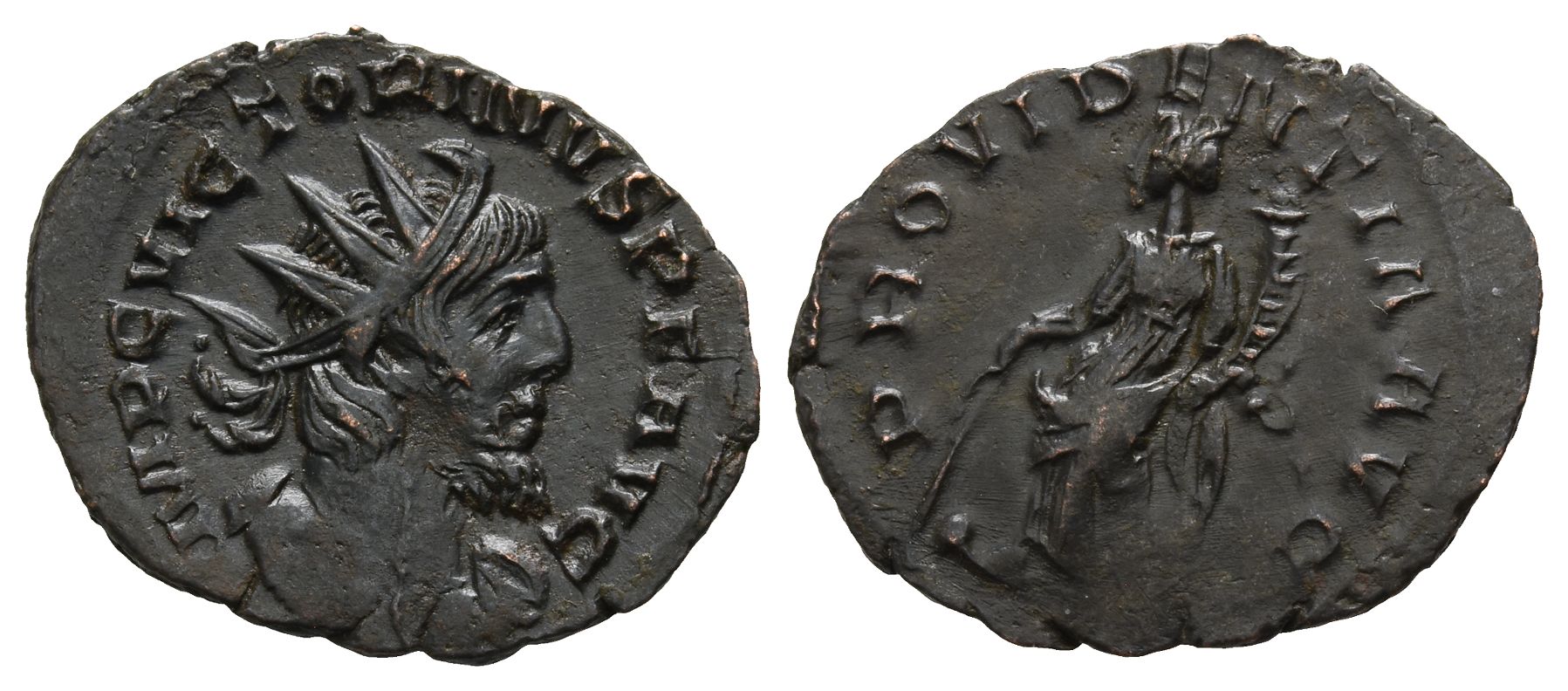 Colonia Agrippinensis mint; struck AD 271. IMP C VICTORINVS P F AVG, radiate and cuirassed bust to right / PROVIDENTIA AVG, Providentia standing facing, head to left, holding baton above globe with right hand and cornucopia with left. RIC V.2 61 (Southern mint). 2.02gr, 22mm, 1h.