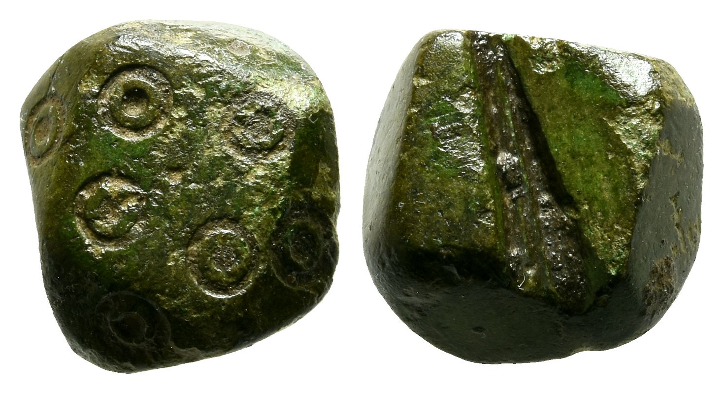 Polyhedral bronze weight with 'bird's eye' patterns and a large groove on the sides. 4.67gr, 12mm x 6mm.
