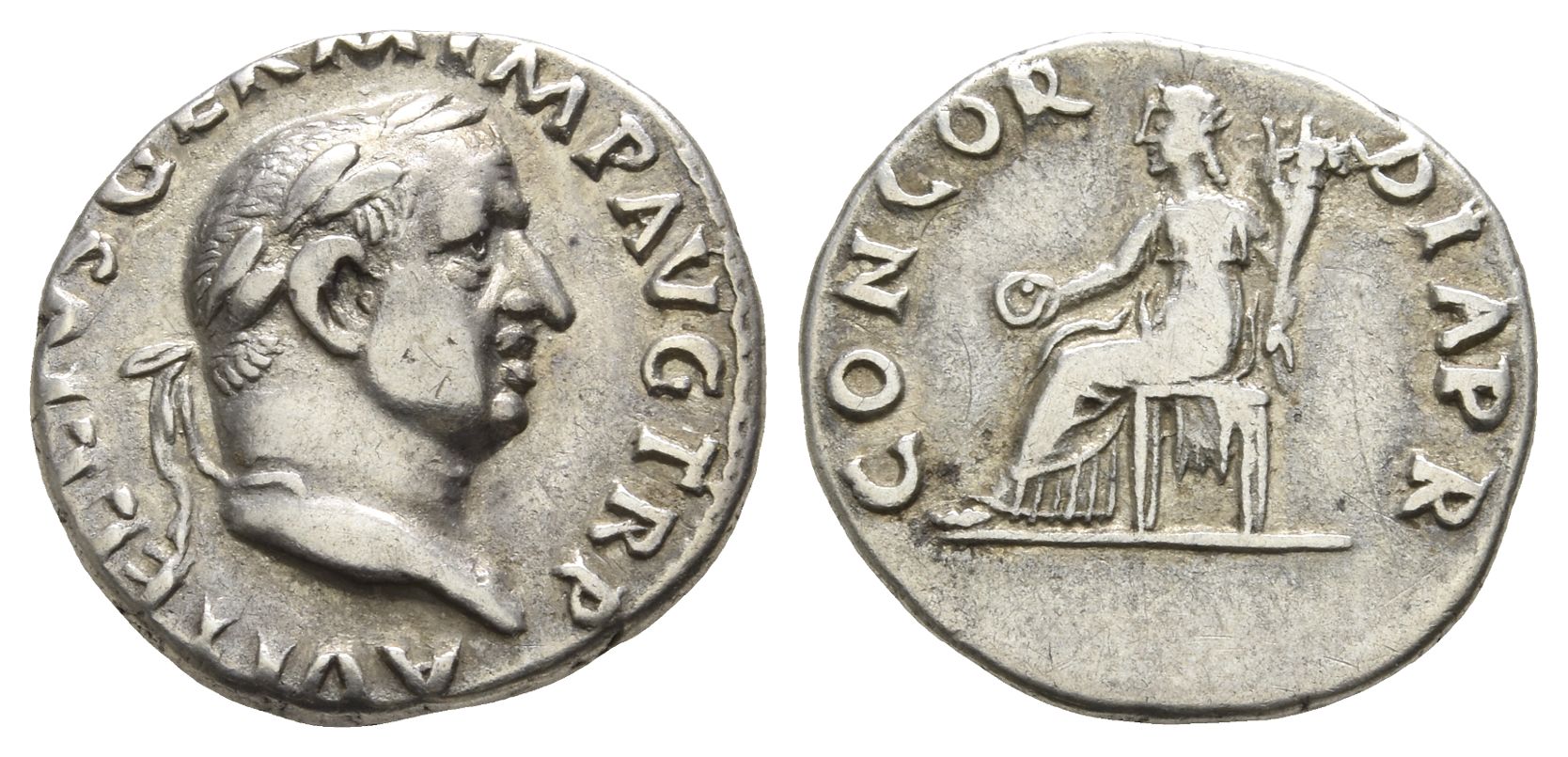 A VITELLIVS GERM IMP AVG TR P, laureate head to right / CONCORDIA P R, Concordia seated to left, holding patera and cornucopia. RIC I 90; BMCRE 20; RSC 18. 3.39gr, 18mm, 6h.