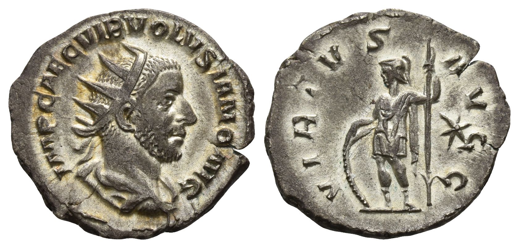 Rome mint. IMP CAE C VIB VOLVSIANO AVG, radiate, draped and cuirassed bust to right / VIRTVS AVGG, Virtus standing to left, holding grounded shield and spear; star in right field. RIC IV 187; RSC 135a. 3.10gr, 21mm, 7h.