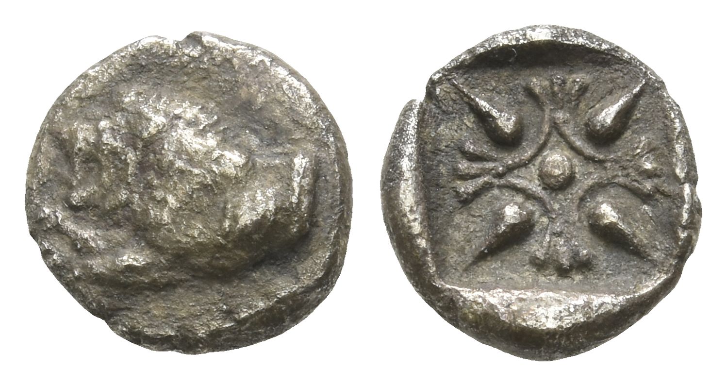 The fact that the present coin has the same reverse stellate pattern as the Diobols of Miletos (cf. SNG Kayhan I 462-75 and SNG Copenhagen 953) and some of the silver coins of the satraps of Caria (cf. HN Online 2926), leads us to attribute its origin to one of these two regions.