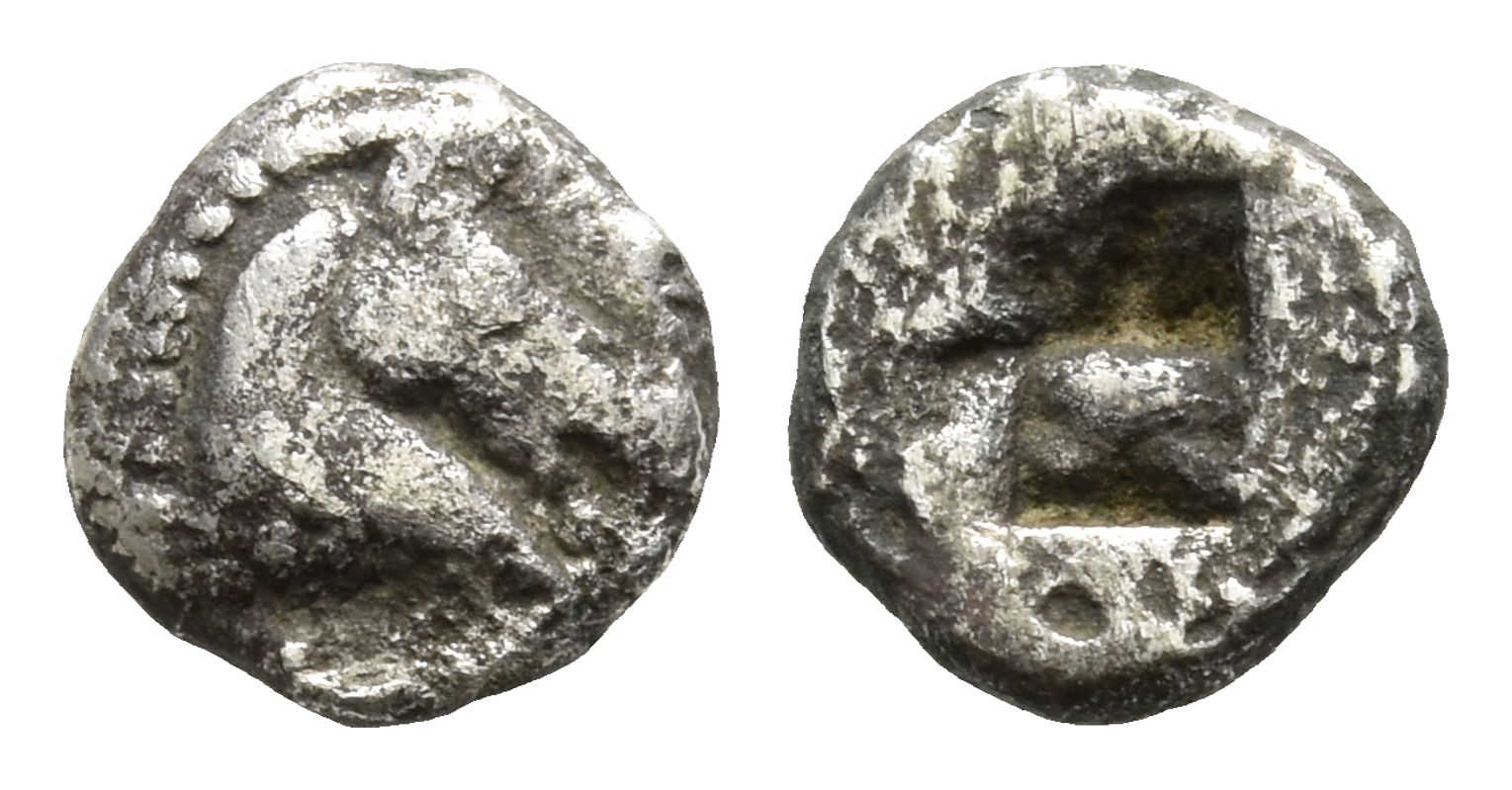 Head of horse to right, neck ending in beaded truncation / Quadripartite incuse square. Cf. SNG Kayhan 745 (head to left; uncertain Ionian or Karian mint); cf. Klein 332 (Kyme, Aeolis); cf. Tzamalis 88 (cruder style; Thraco-Macedonian mint); CNG e466, 120; Roma e88, 398. 0.54g, 8mm.