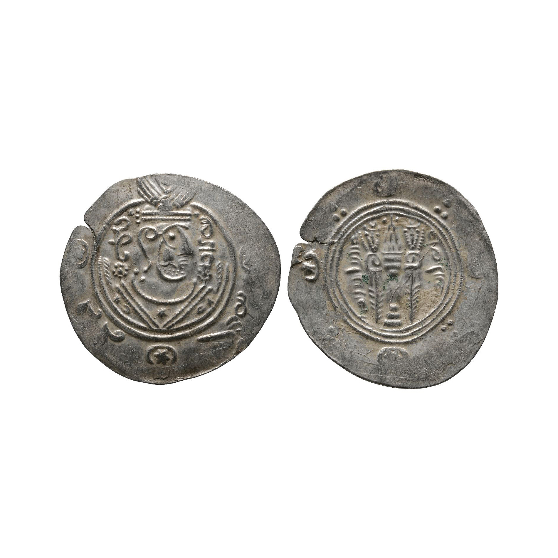 Without any governor's name. Obv: Sasanian bust to the right, phrase 'Apzuti' in Pahlavi in front of face, phrase APD in Pahlavi in the second quarter, phrase 'NWKY' on the third quarter. Rev: fire altar with attendants, mint 'TPURASTN (Tabaristan)' on the right, date: 106. 1.51 grams, 24 mm.