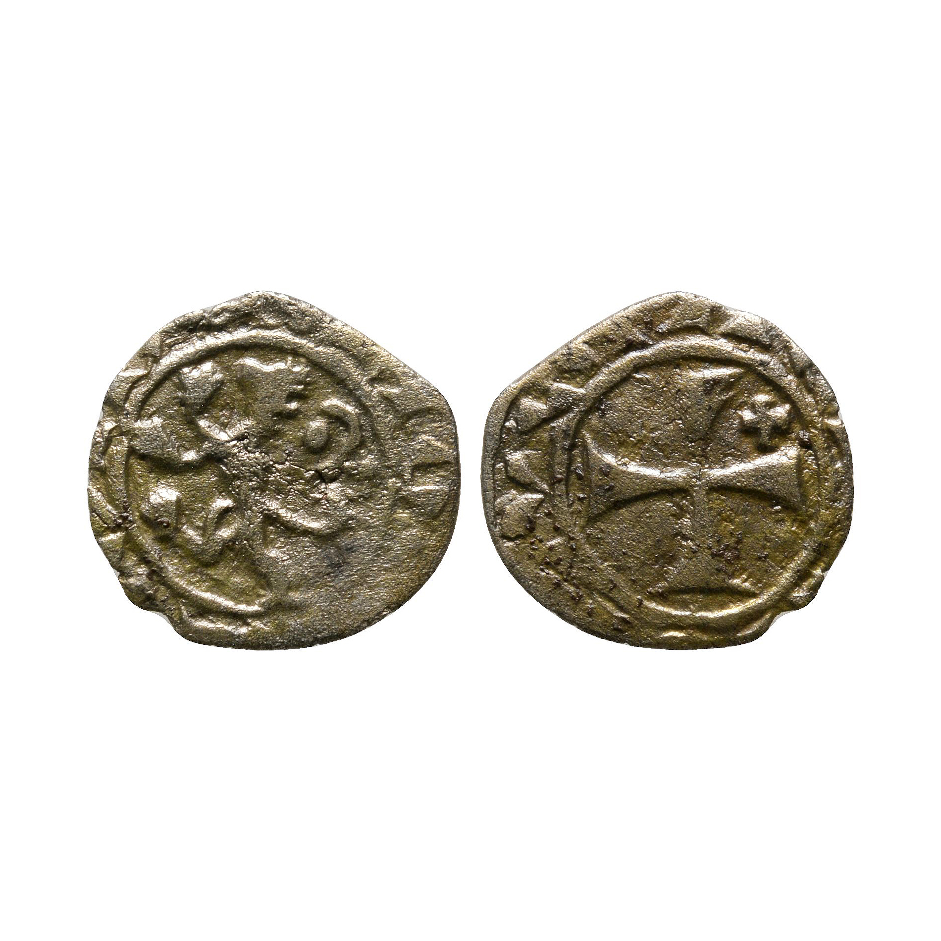 Obv: lion rampant left. Rev: Jerusalem cross. 0.45 grams, 14 mm.