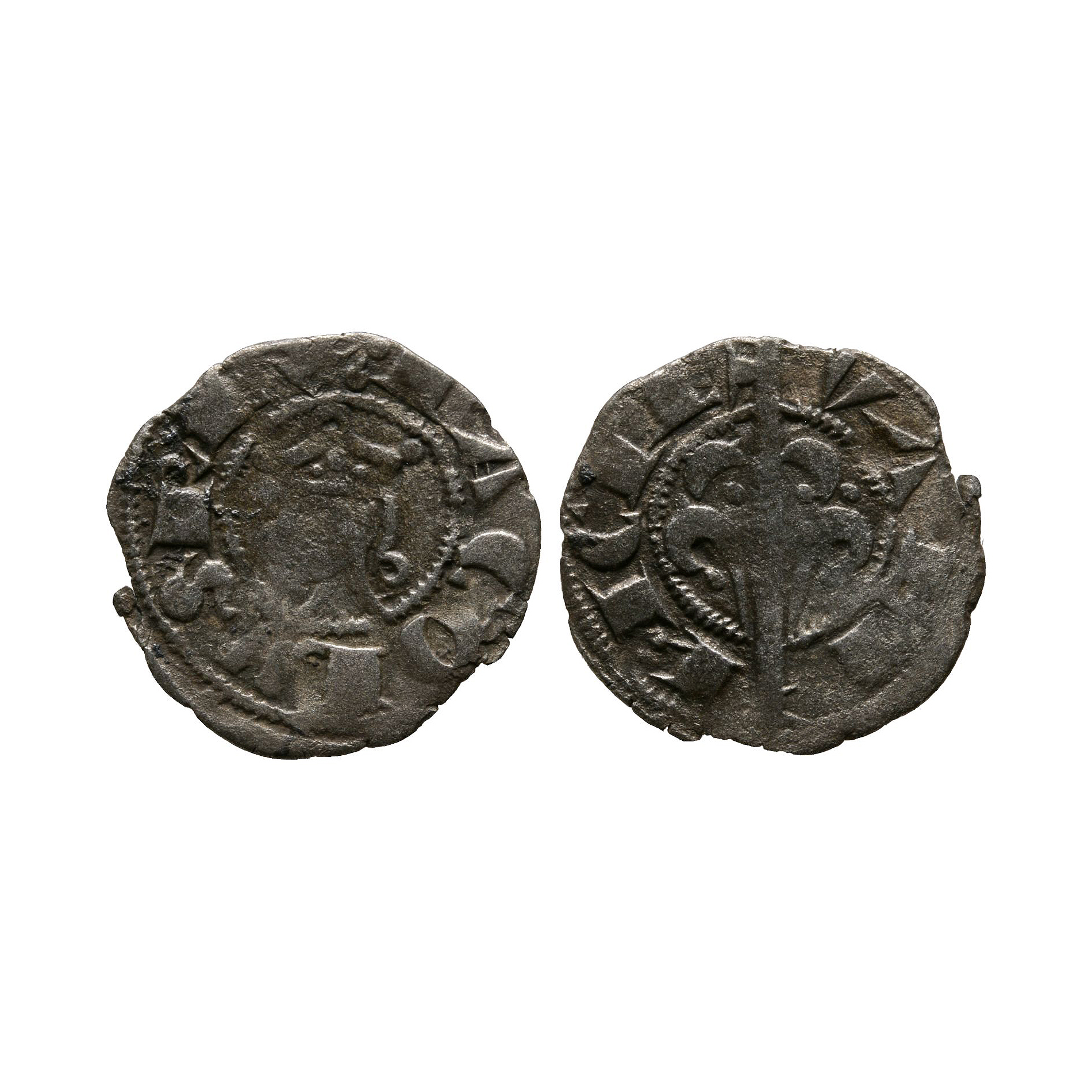 Obv: IOCUBUS REX, bust facing left. Rev: VALENCIE, croix sur arbre. 0.72 grams, 17 mm.