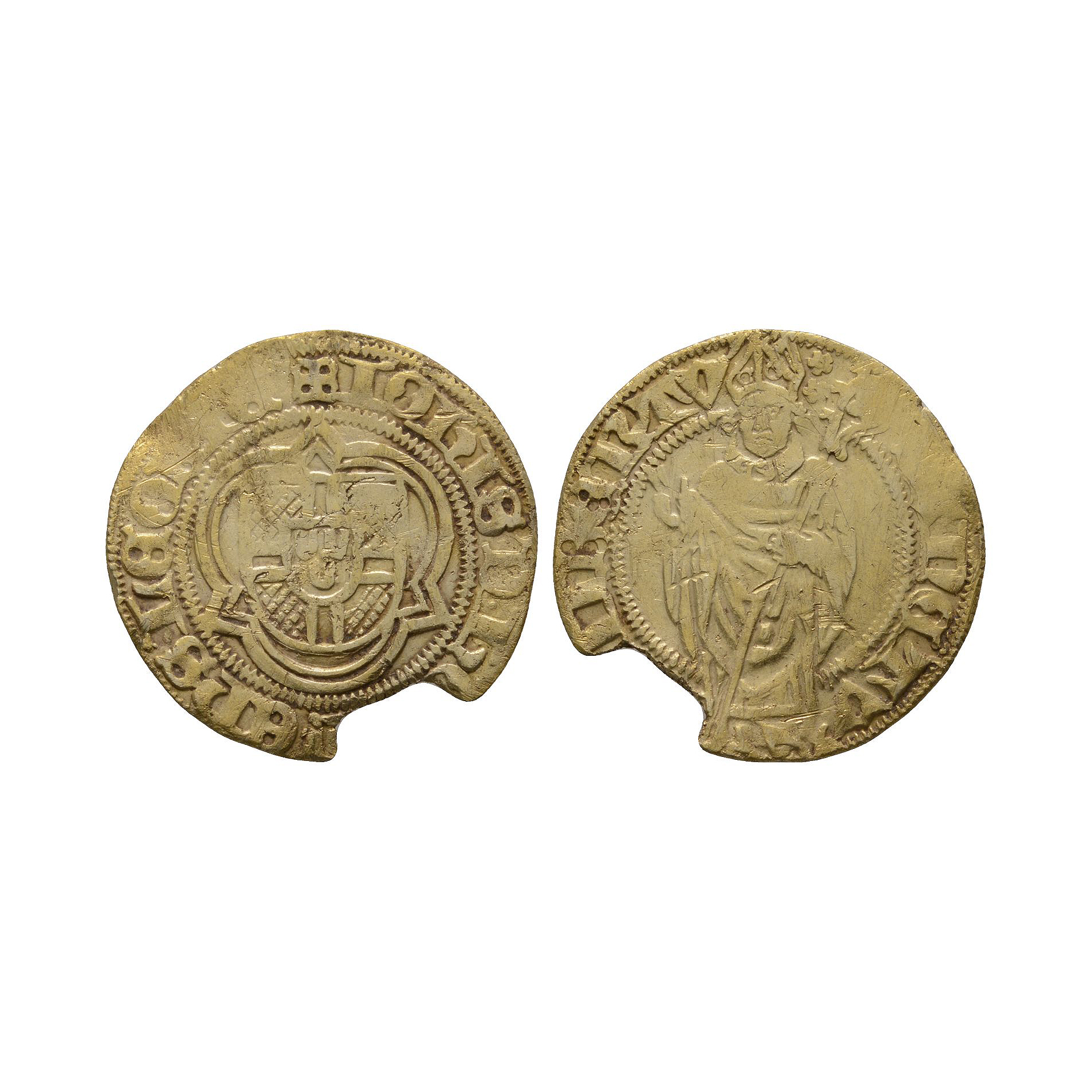Obv: standing archbishop with transverse sceptre, legend around. Rev: shielded of arms in pointed trilobe, legend around. 2.56 grams, 21 mm.