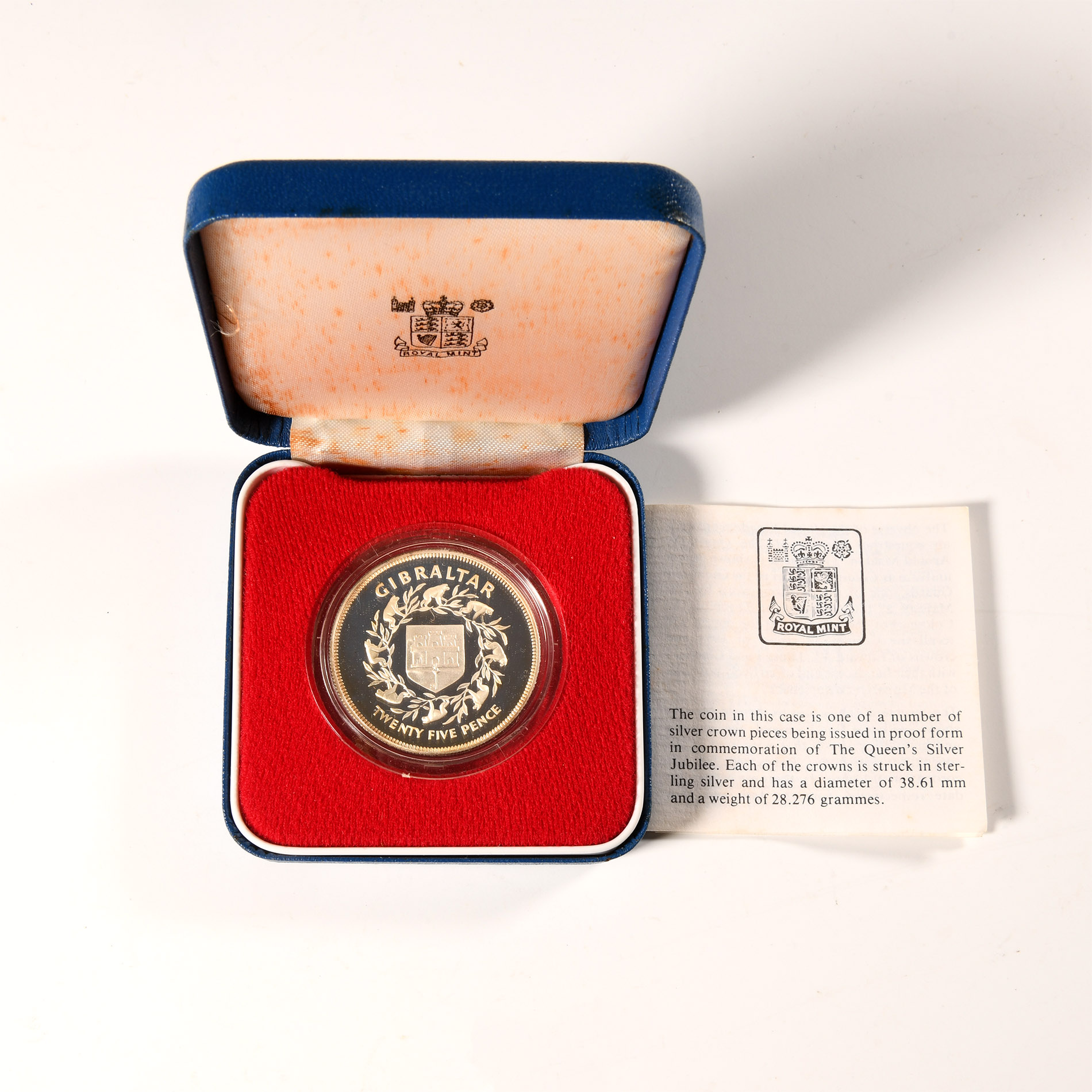 Obv: profile bust with QUEEN ELIZABETH THE SECOND 1952-1977 legend. Rev: arms within barbary ape wreath with GIBRALTER TWENY FIVE PENCE legend; in capsule and case of issue, with certificate. 109 grams total, case 77 x 77 mm.