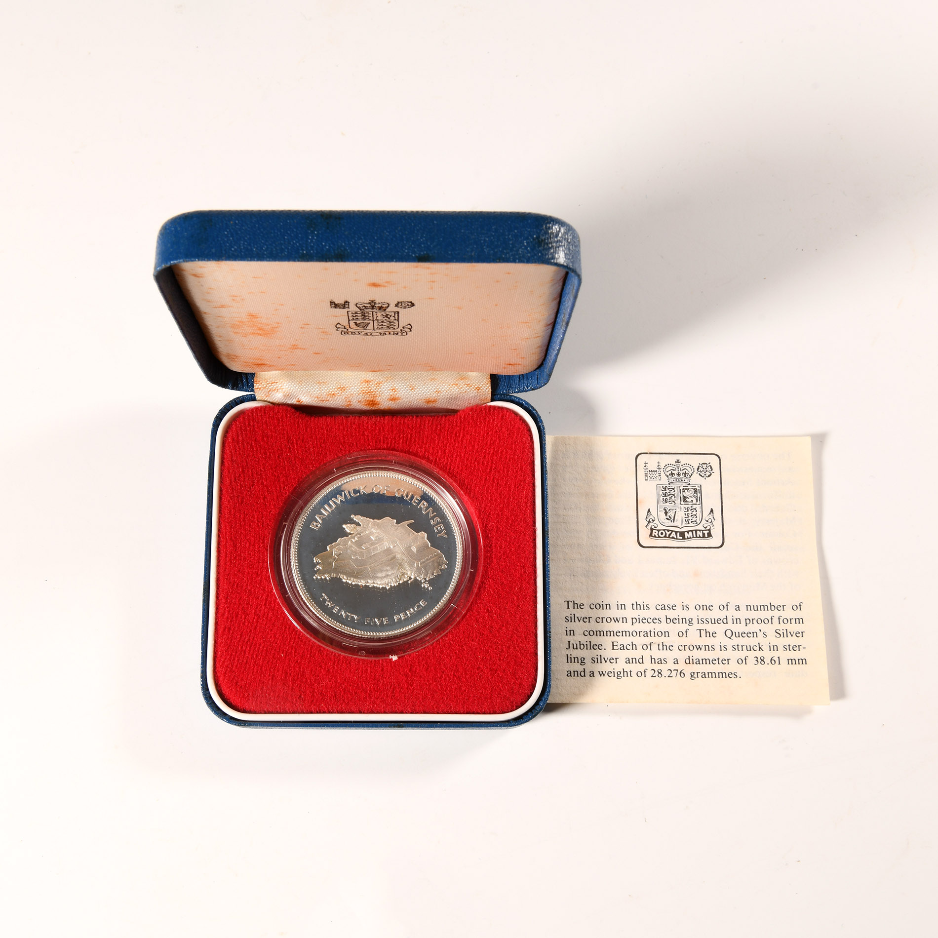 Obv: profile bust with QUEEN ELIZABETH THE SECOND 1952-1977 legend. Rev: Castle Cornet with GUERNSEY TWENTY FIVE PENCE legend; in capsule and case of issue with certificate. 109 grams total, 77 x 77 mm including case