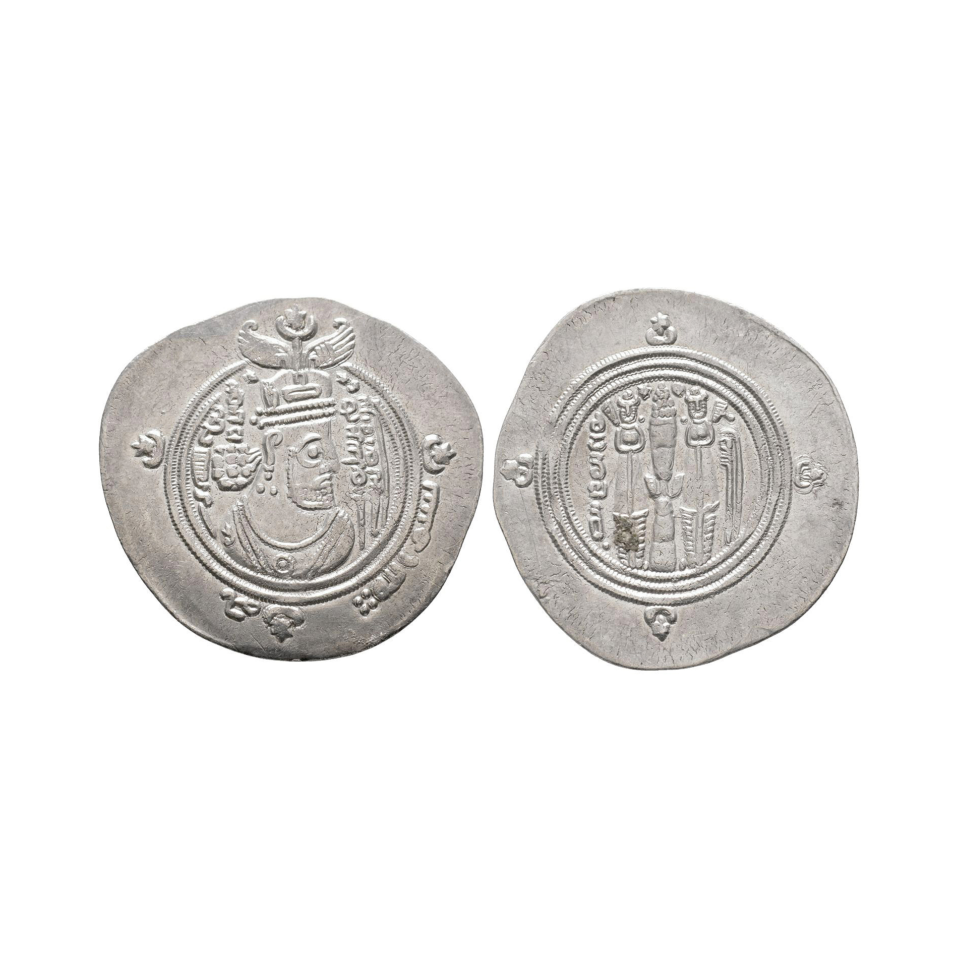 Bishapur mint. Obv: profile bust with inscription in margin. Rev: fire altar and attendants. 4.19 grams, 32 mm.
