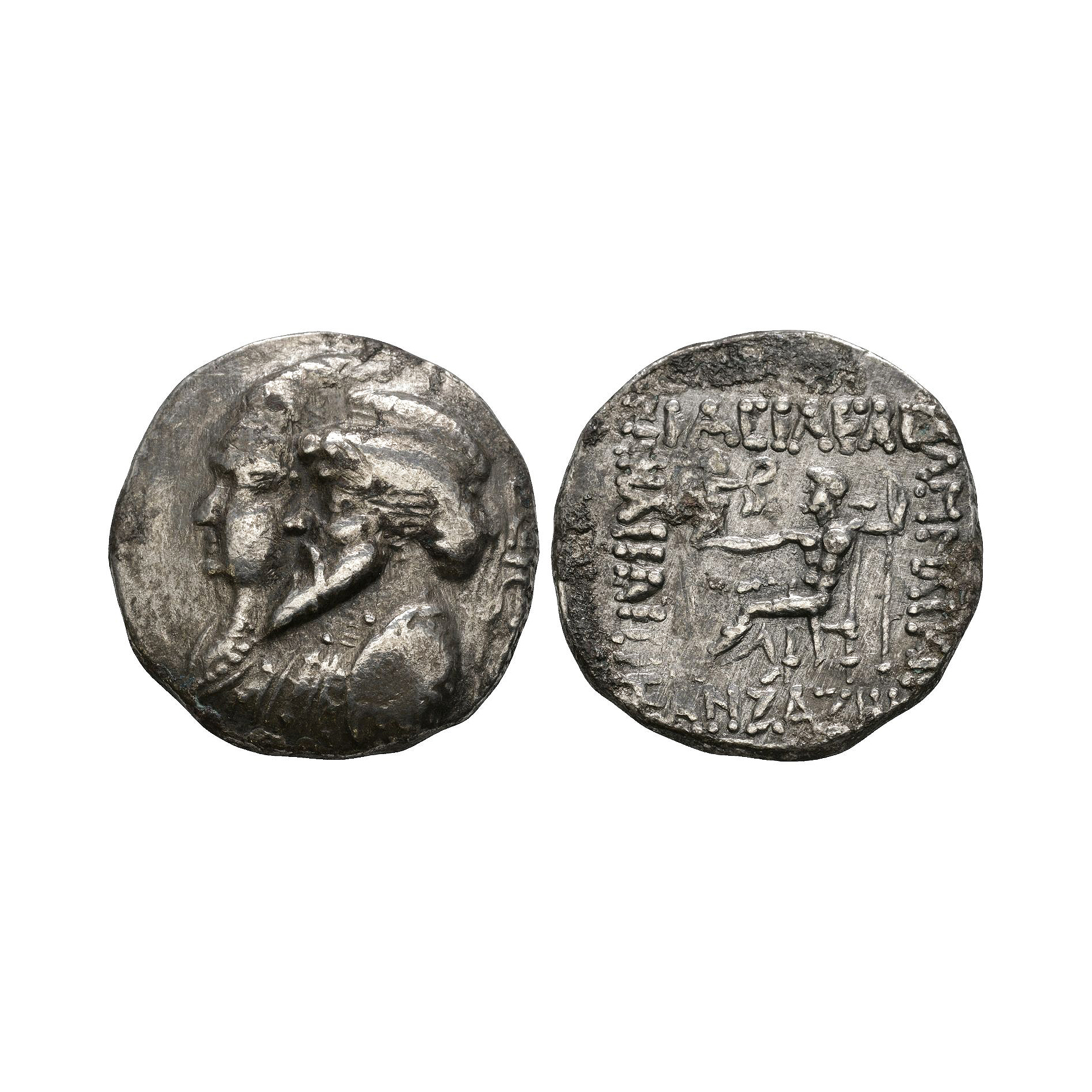 Obv: jugate profile busts left with Seleukid anchor terminating in monogram behind. Rev: Zeus seated to left, holding sceptre and Nike, who crowns him with IΛCIΛEΩC KΛMNΛCKIPOY KΛI IΛIIΛIICHC ANZAZH around. 14.29 grams.